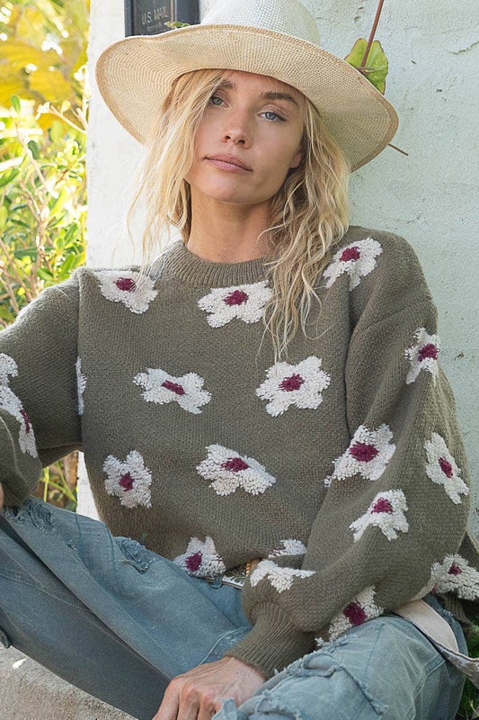 Olive Oversized Round Neck Daisy Floral Pattern Sweater
