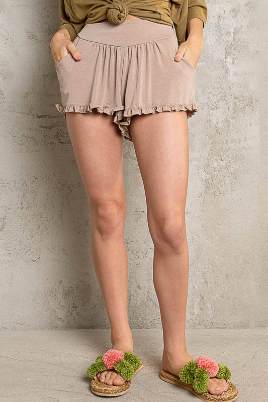 Mocha Back Elastic Waistband Ruffle Trim Dolphin Knit Shorts