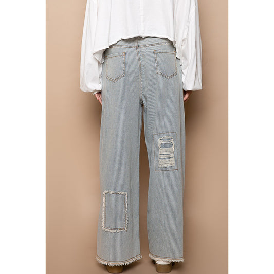 Distressed Lightweight Railroad Stripe Denim Pants w Frayed Edges