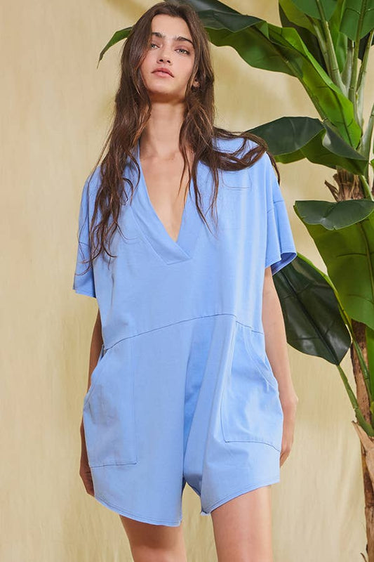 Blue Oversized Wide Legs Solid Romper With Pockets