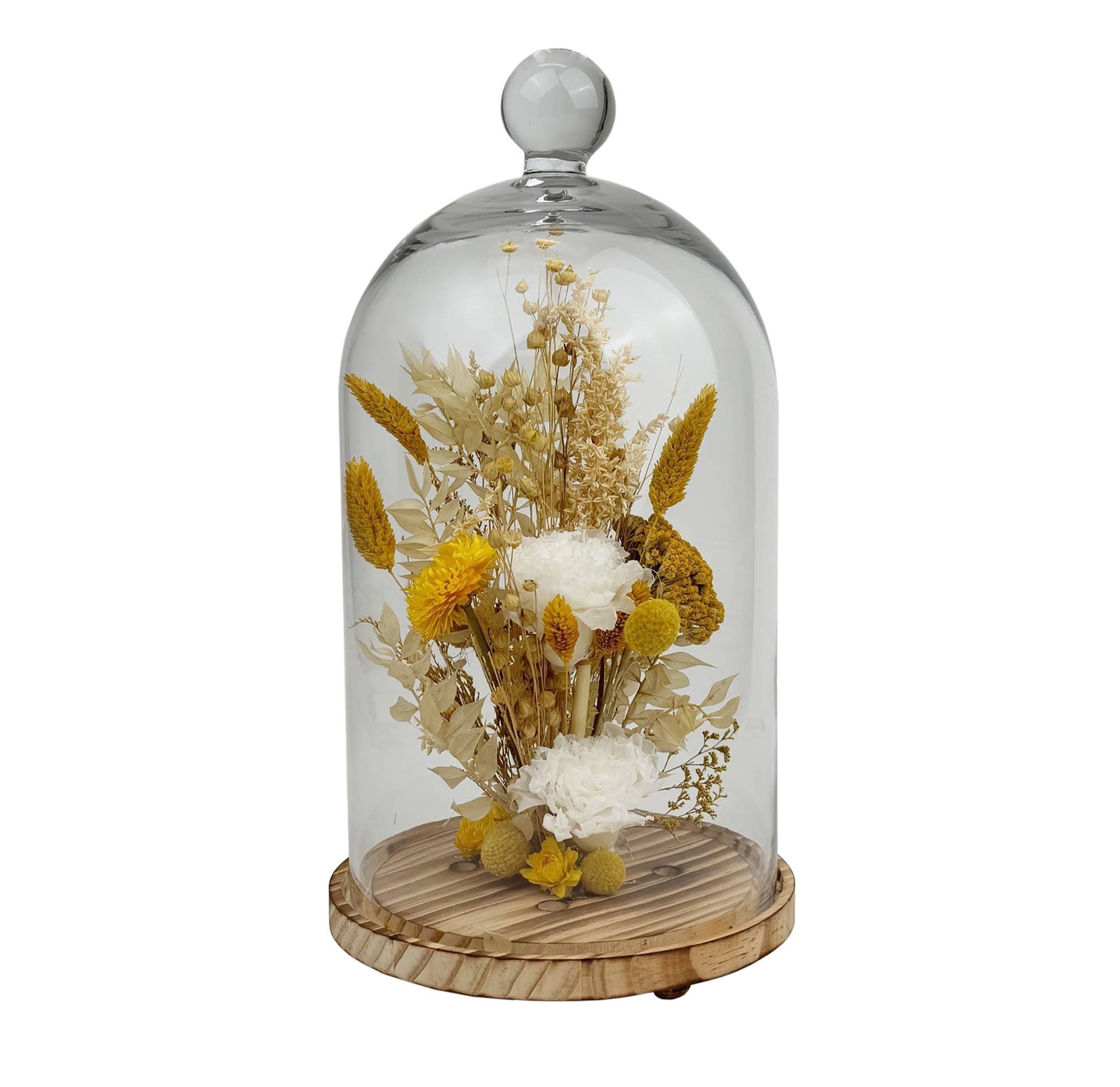 A preserved real carnation is arranged among a mix of natural botanicals like phalaris, yarrow, and strawflowers in this stunning floral arrangement placed in a large glass cloche on a wooden pedestal base. This centerpiece is full of natural textures and neutral colors that easily accentuate any home and are sure to be a show stopper!