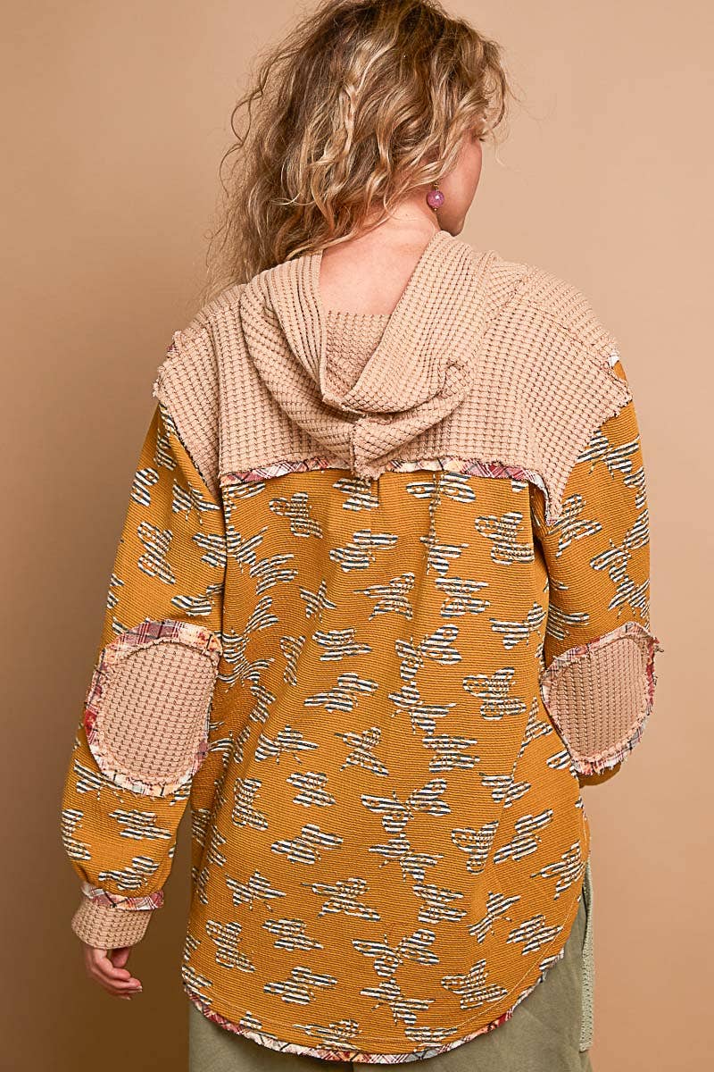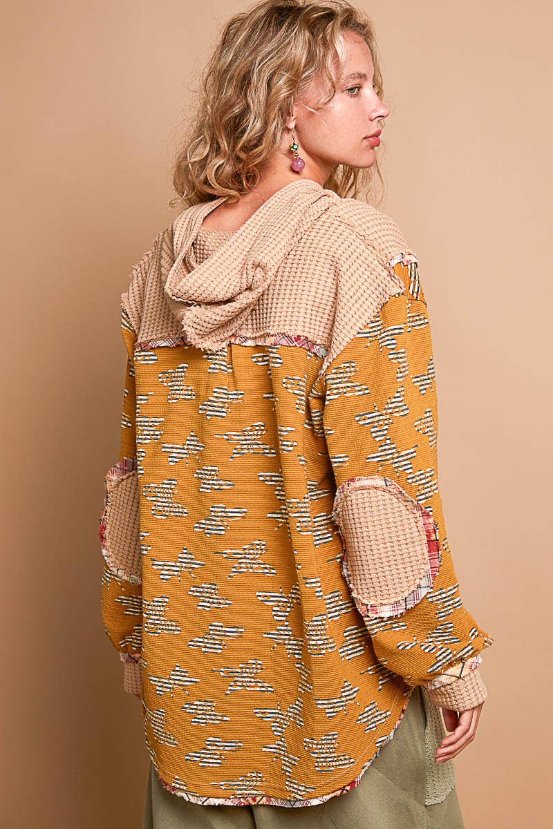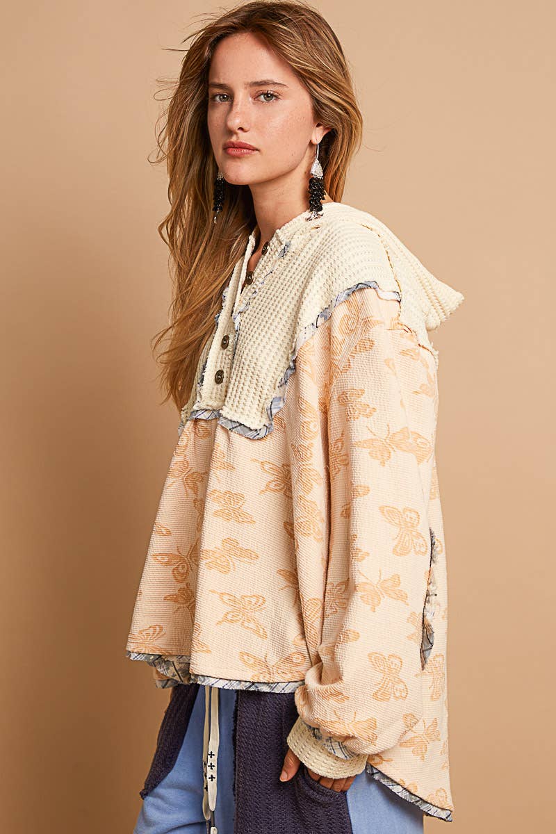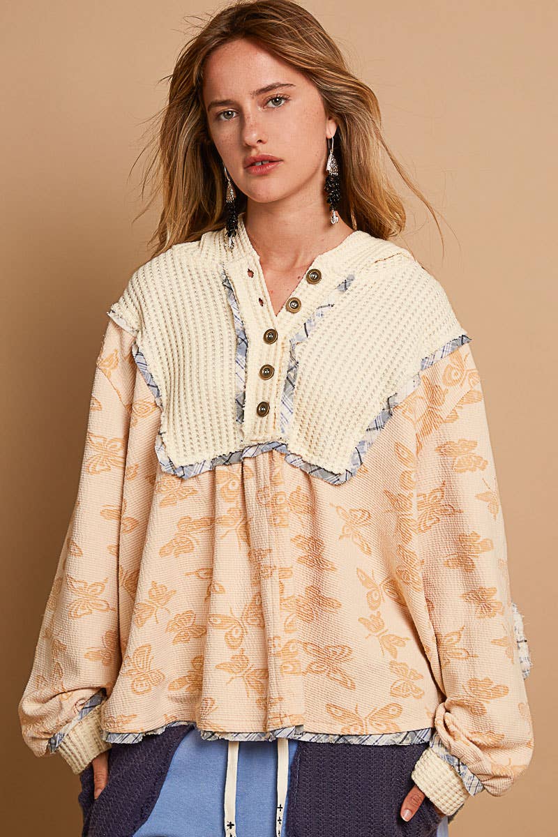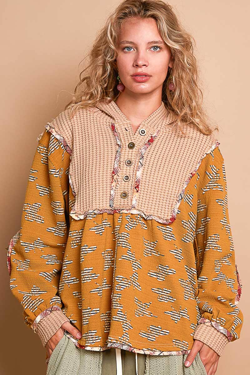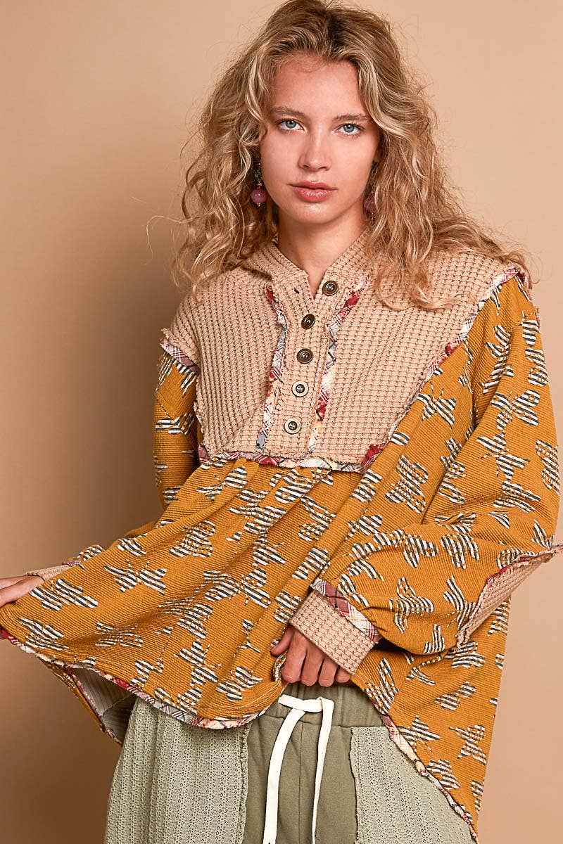 Designed in hooded balloon sleeve roomy fit top in printed knit with plaid trim detail.