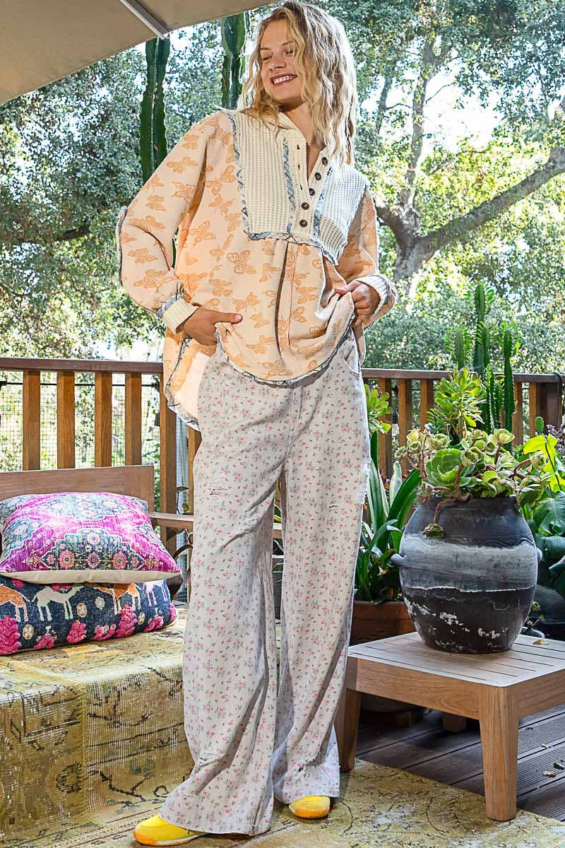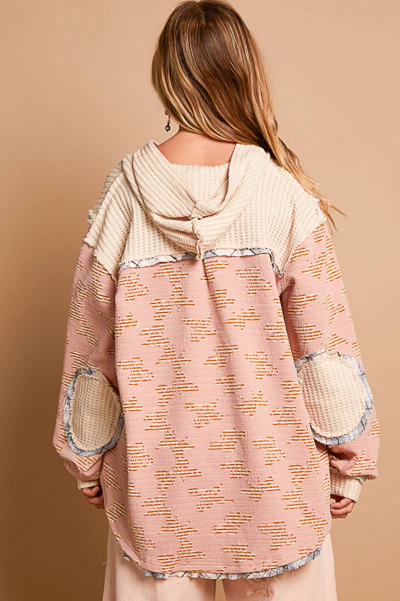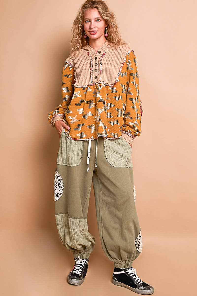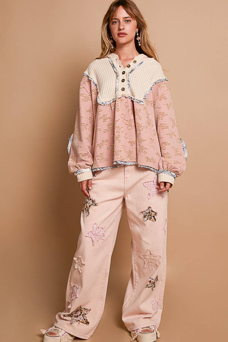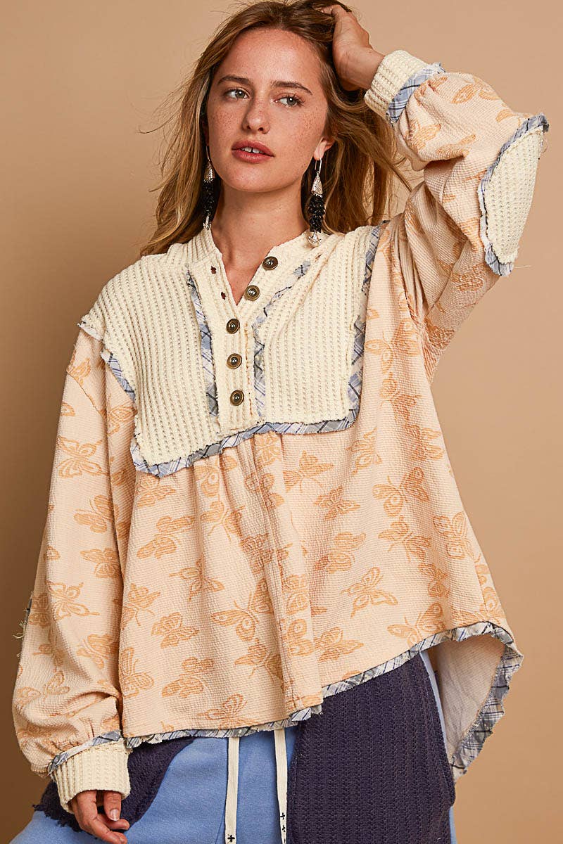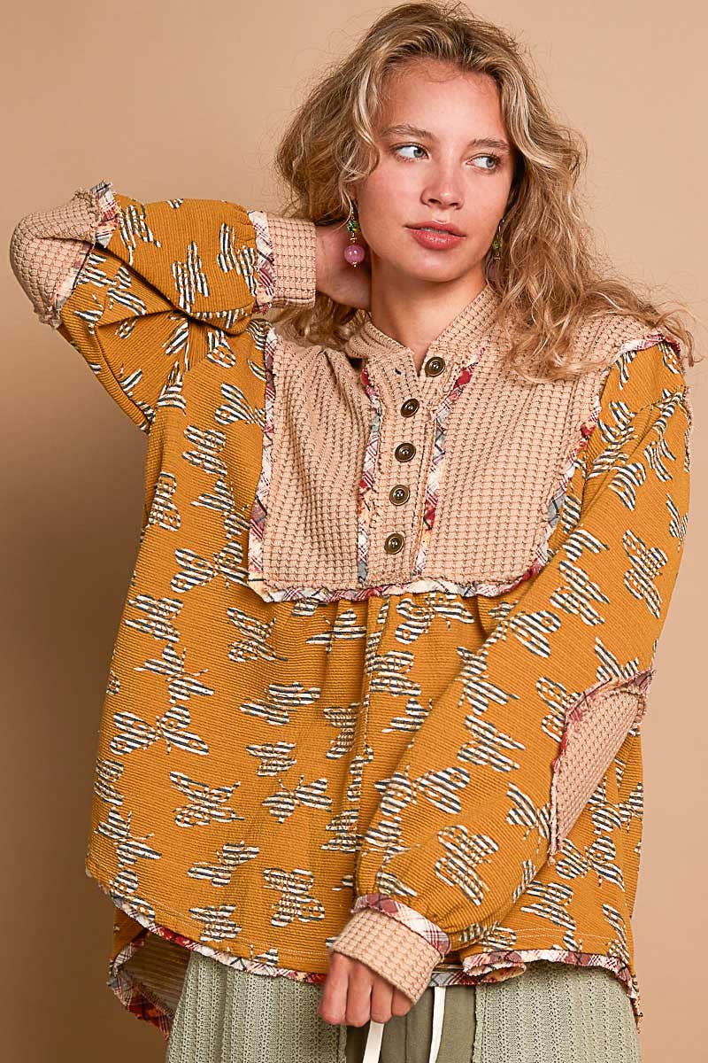 Designed in hooded balloon sleeve roomy fit top in printed knit with plaid trim detail.