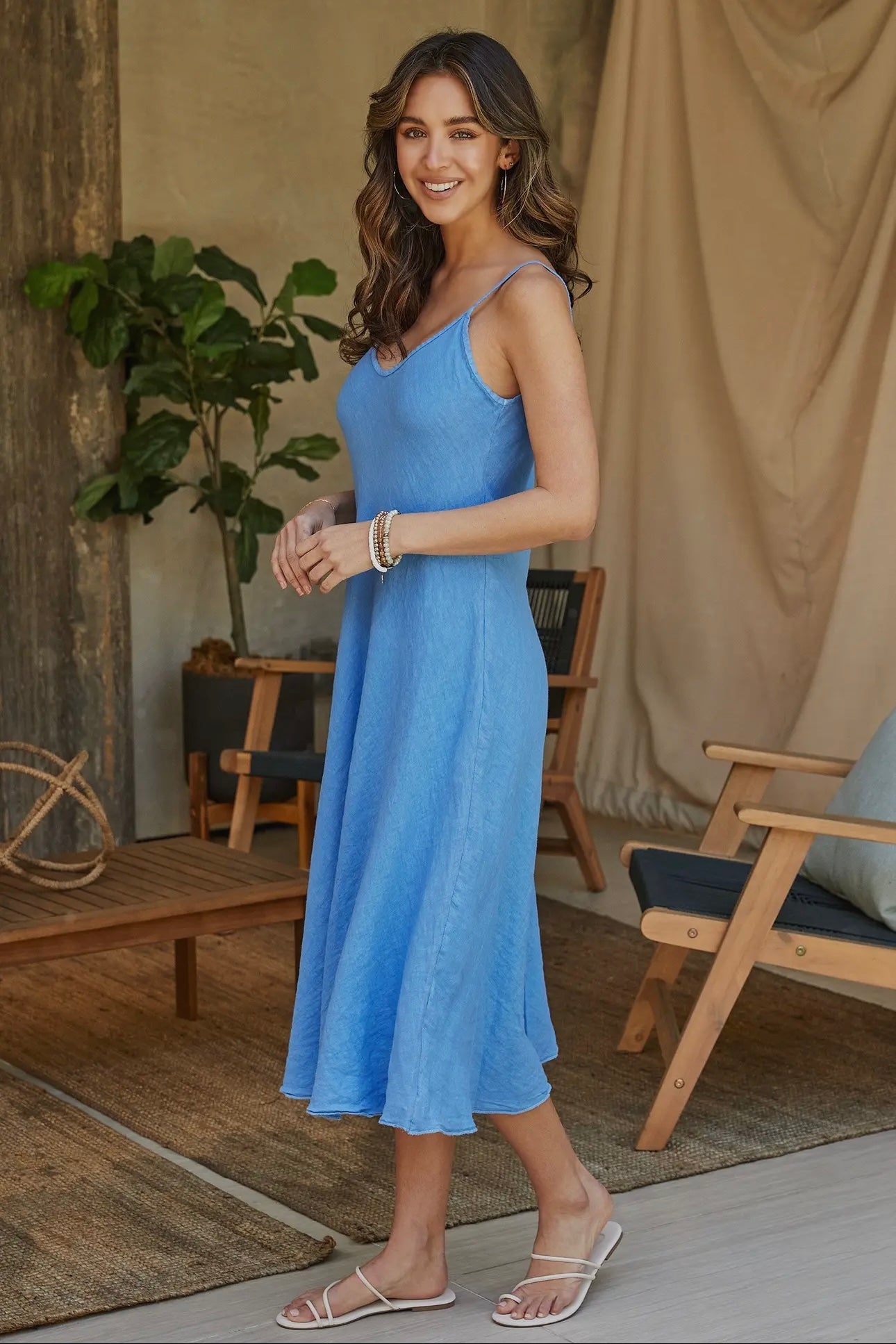 Blue Linen Spaghetti Strap Slip Dress