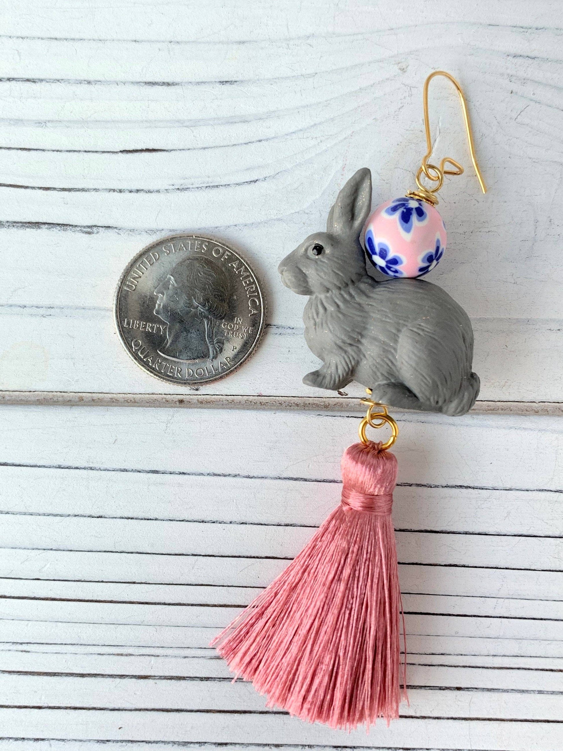 Make a statement with these fun and unique bunny earrings with floral fimo beads and dusty rose silk tassels. 4"L. Gold-plated, nickel-free ear wires. Handmade in the USA.