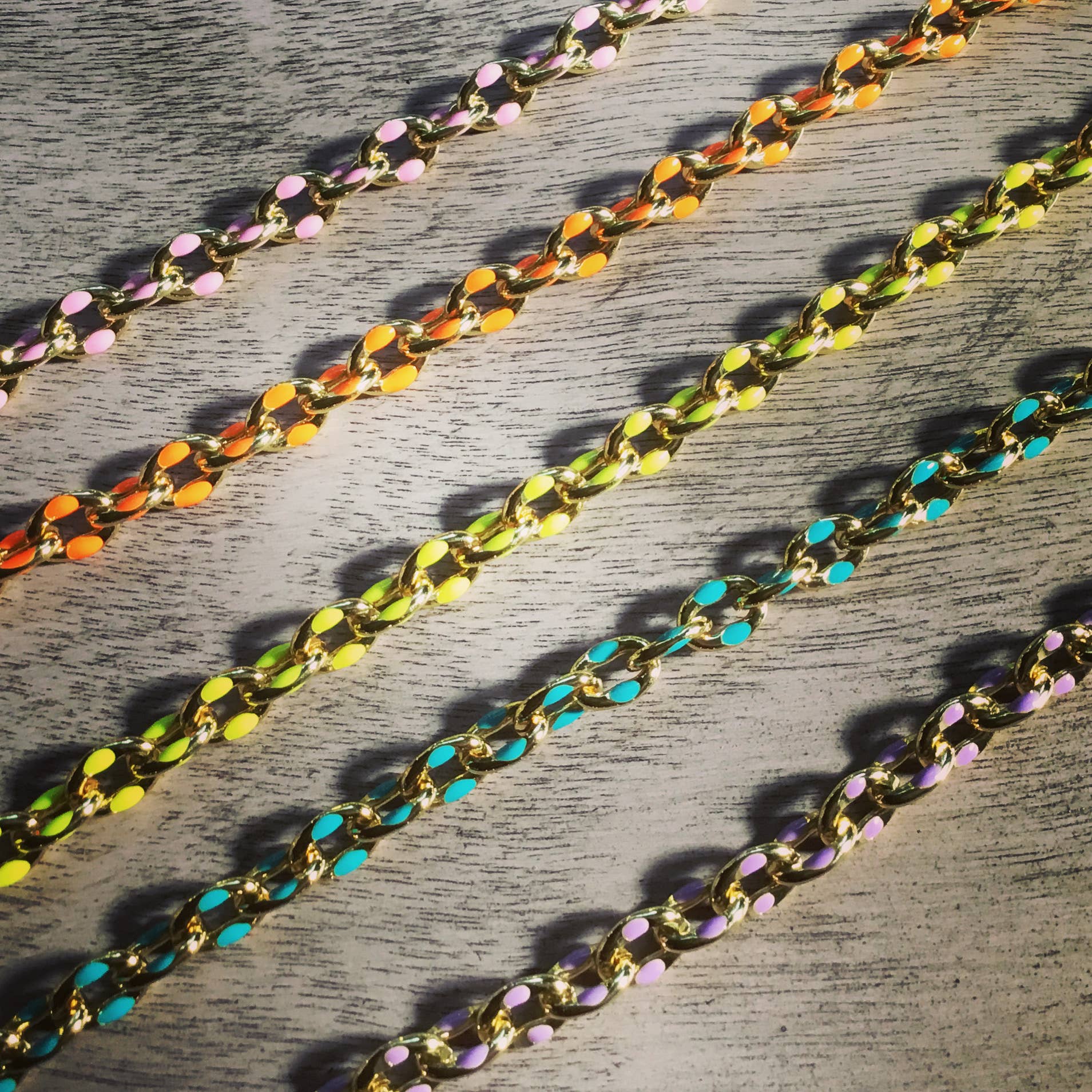 Add a little fun to your outfit with Candy, a 17” colored enamel coated chain with an oval gate clasp that can be worn anywhere. Wear one or get two colors to connect and make a double stack!
