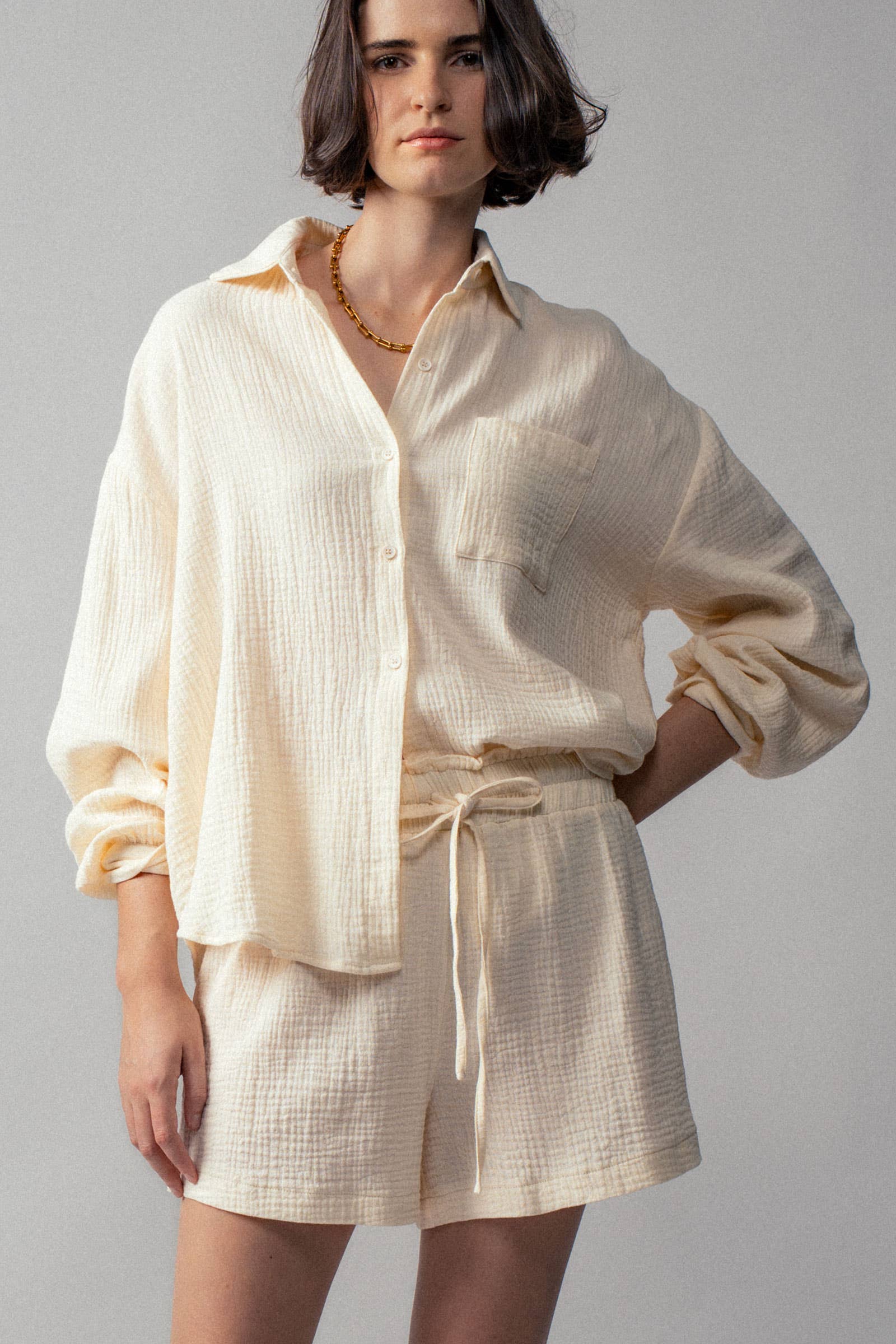 Cream Crinkle Cotton Gauze Resort Button-Up Set