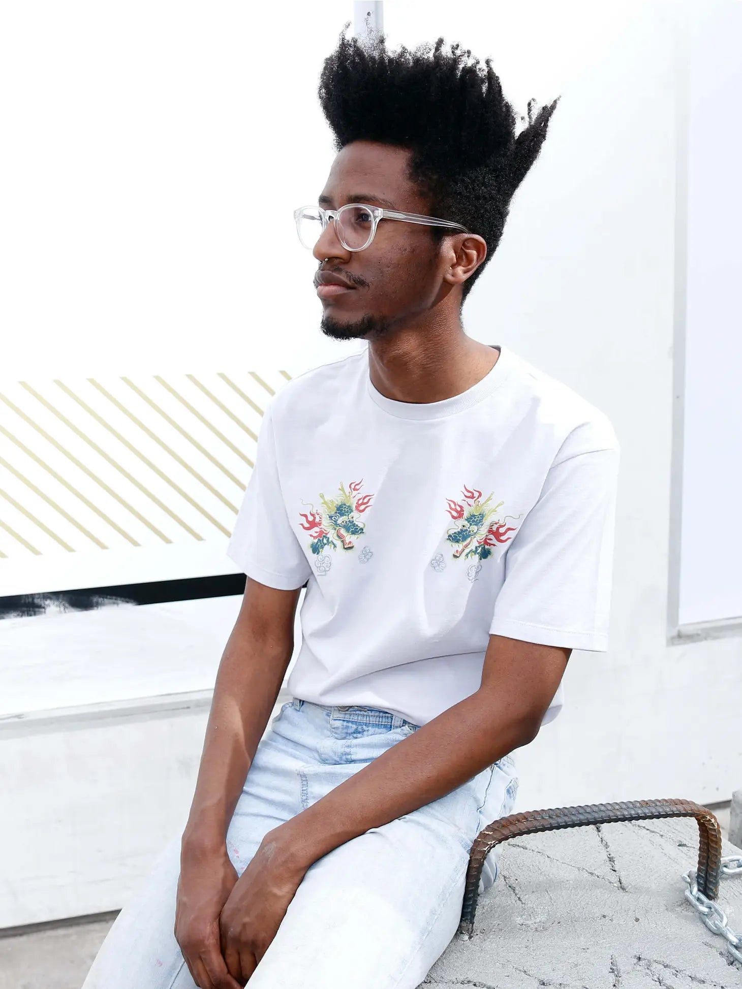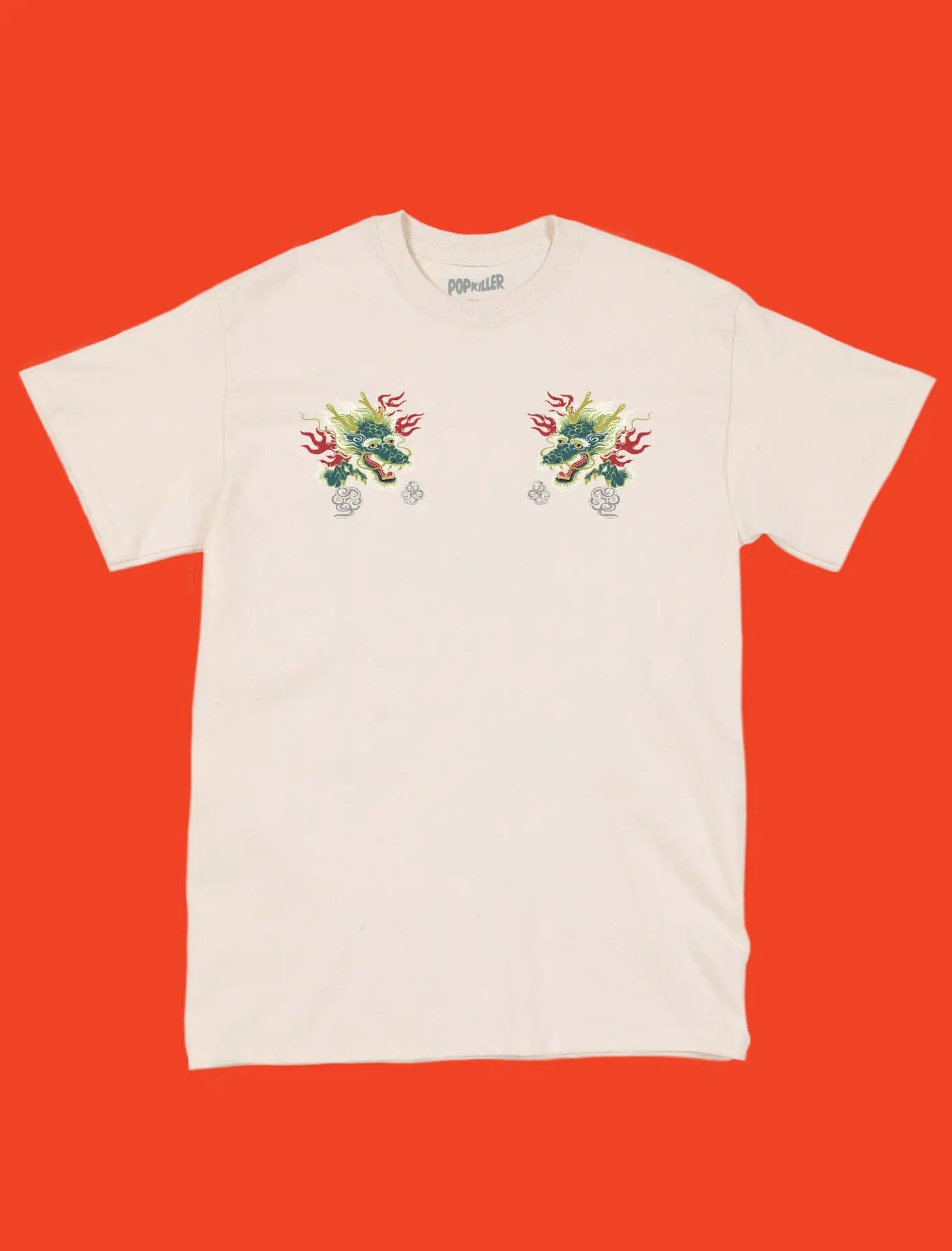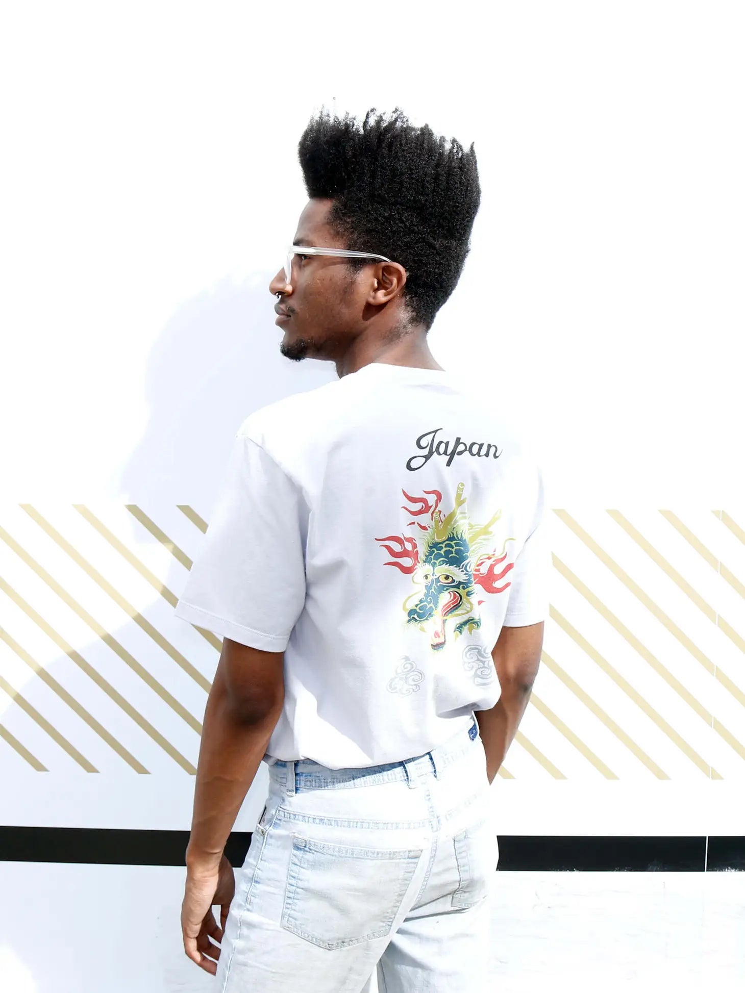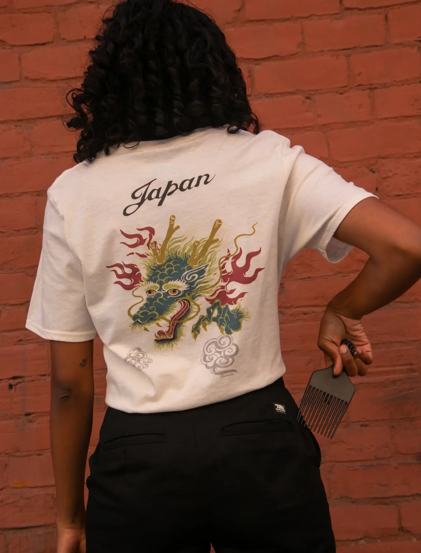 Inspired by ska jackets, or sukajan, the dragon ska tee features a hand-drawn graphic by artist shihori, originally drawn for embroidery. Hand-lettered "japan" is spelled out on the back. This t-shirt has a front and back print.