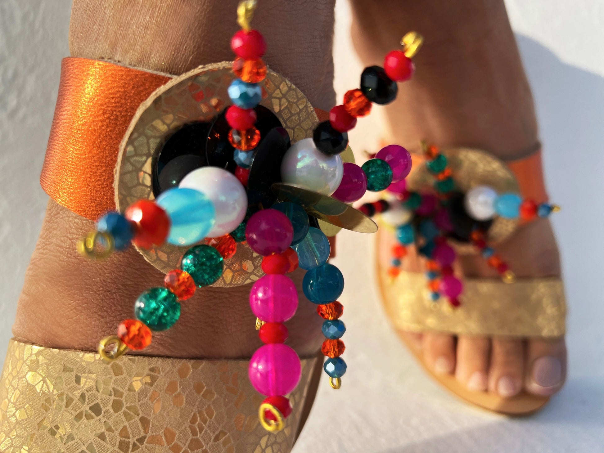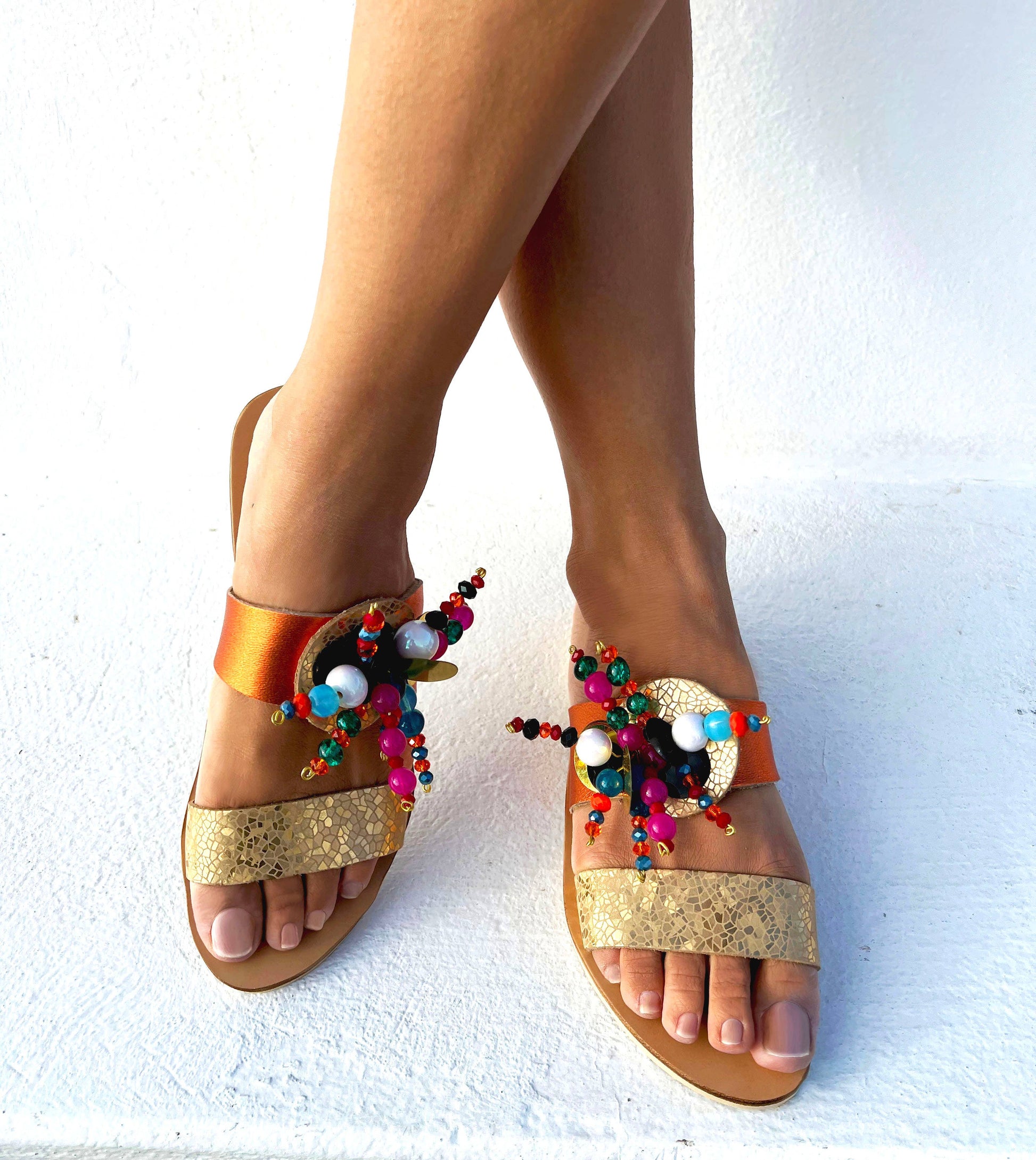 It's summer, Embrace your confidence. A summer capsule wardrobe must-have in this strappy slide in sandals. Rhinestones , beads and tinsels in vibrant colors are the fun part addition for an eye-catching look.
