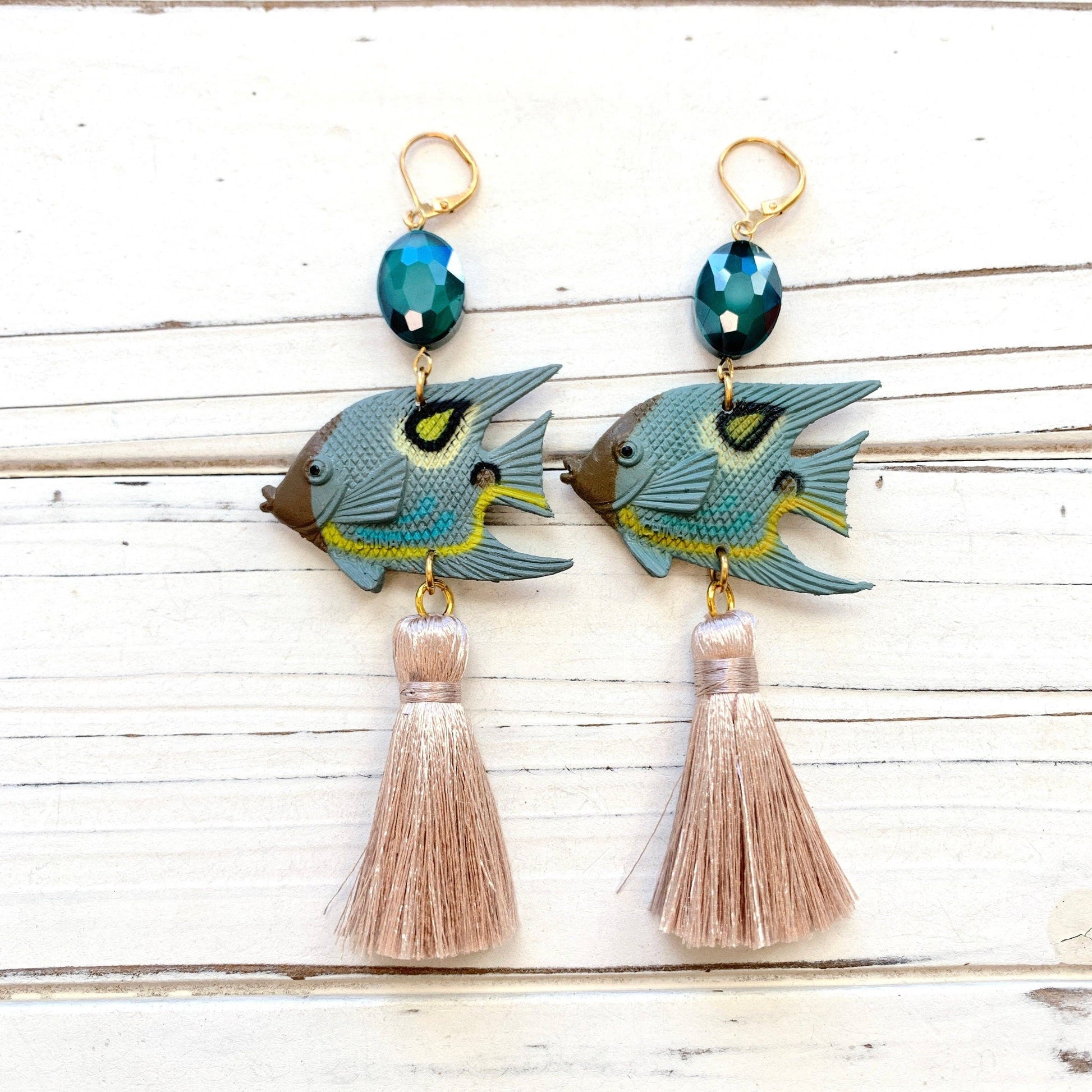 Exotic tropical fish earrings with tassels that will take your resort look next level. Resin tropical fish, silky tassels, and faceted glass beads with AB finish together make a unique dangle earring that's both fun and sophisticated.