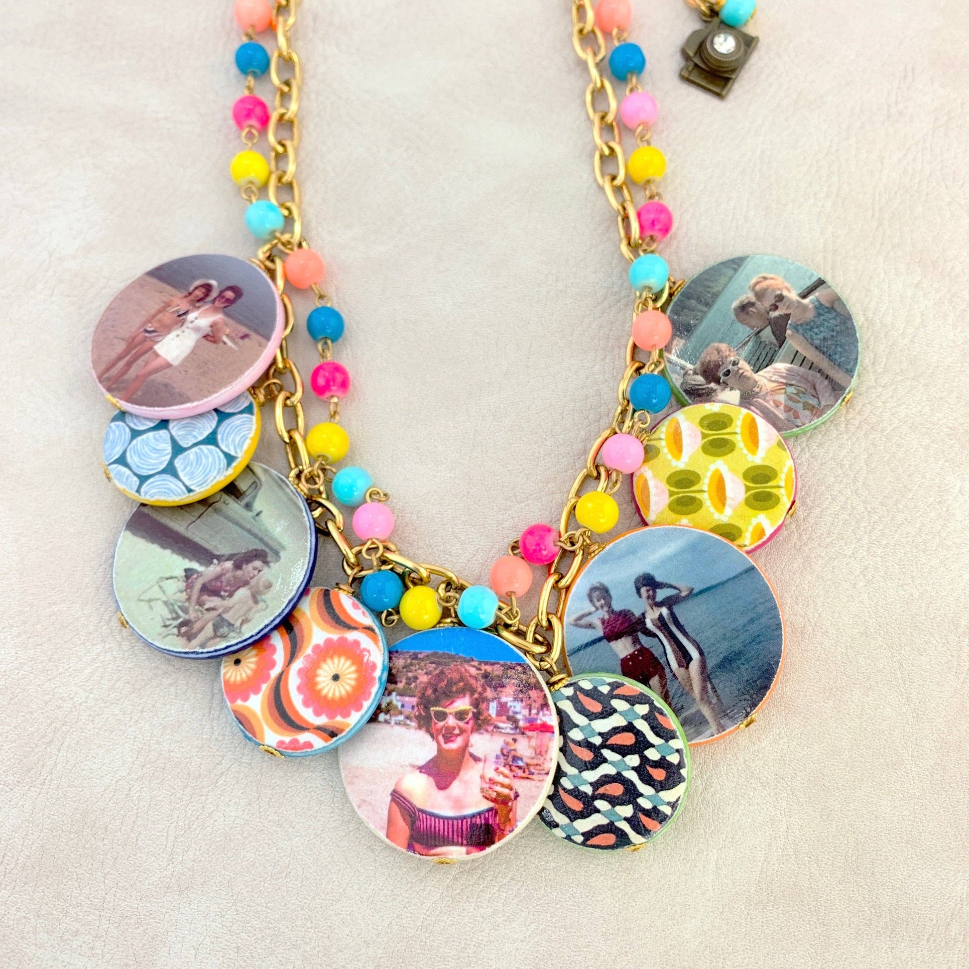 Get vacation ready in this fun beach themed statement necklace filled with nostalgic vintage photos of ladies on vacation. This beach necklace has all the feels of summers on Coney Island long ago. You can almost smell the hotdogs! Bright cheerful colored beads complement the vintage textile prints and old photo prints decoupaged on bold sized disc beads turned charms. 2-layers for an effortless stacked necklace look. Solid and sturdy gold-plated steel chain.