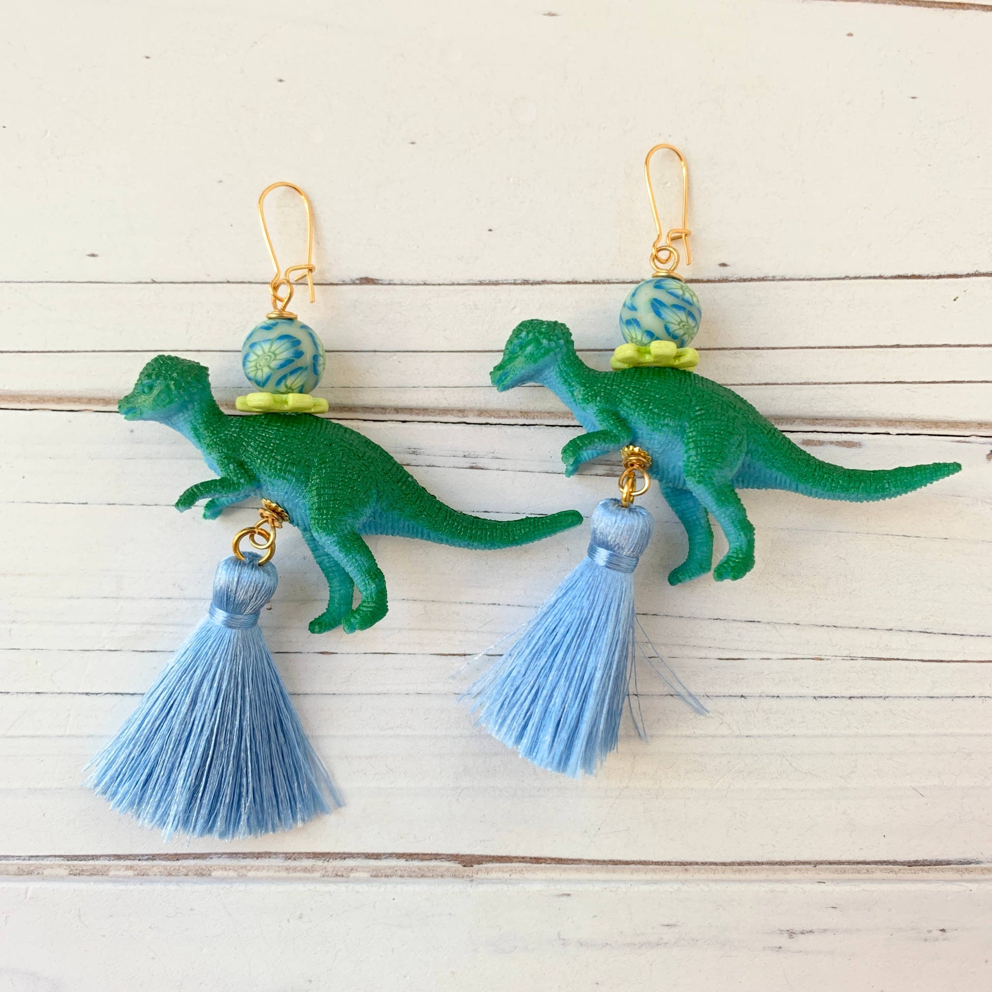 Make a statement with these fun dinosaur earrings with floral and fimo bead dressing and ski blue tassels. 3.75" drop. Nickel free gold plated ear wires.
