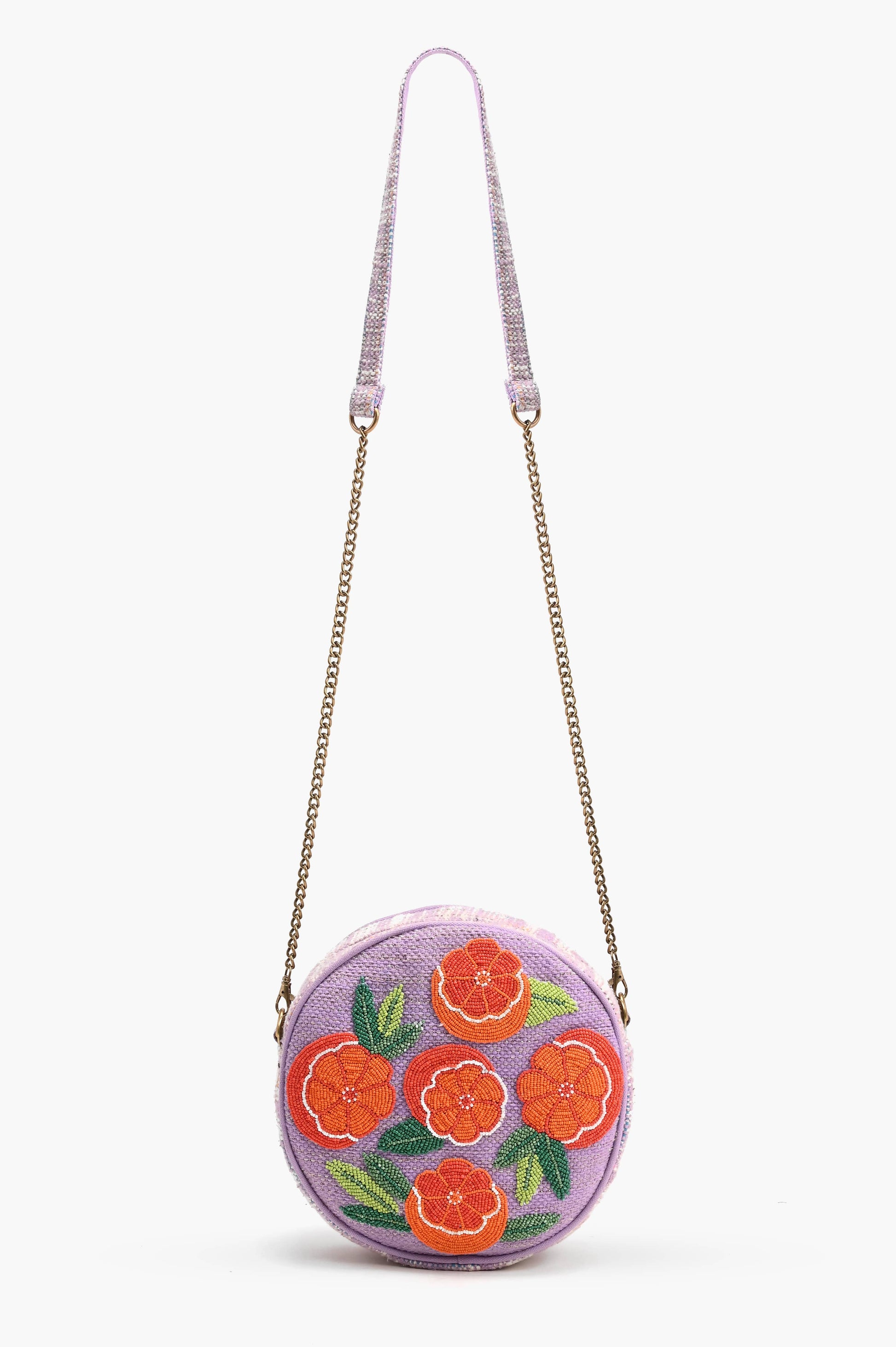 Circular shaped crossbody bag, hand embellished front with bright tangerines,
