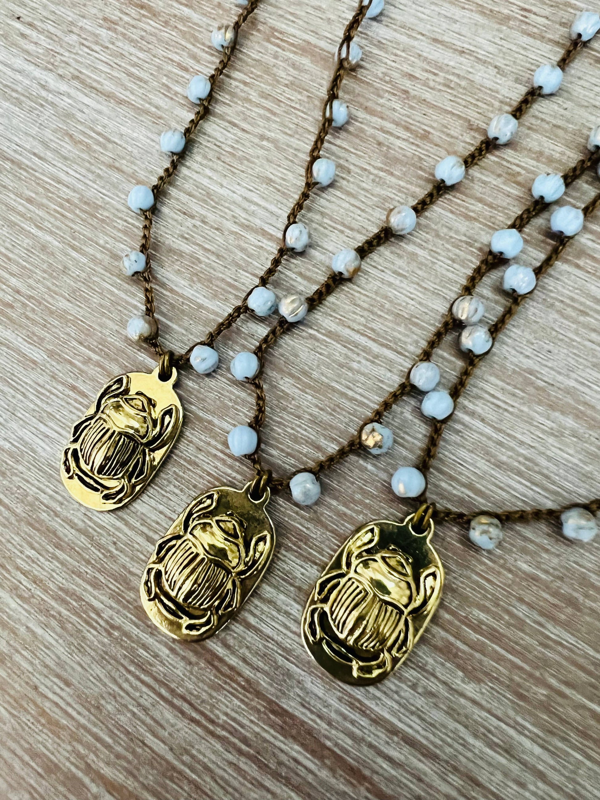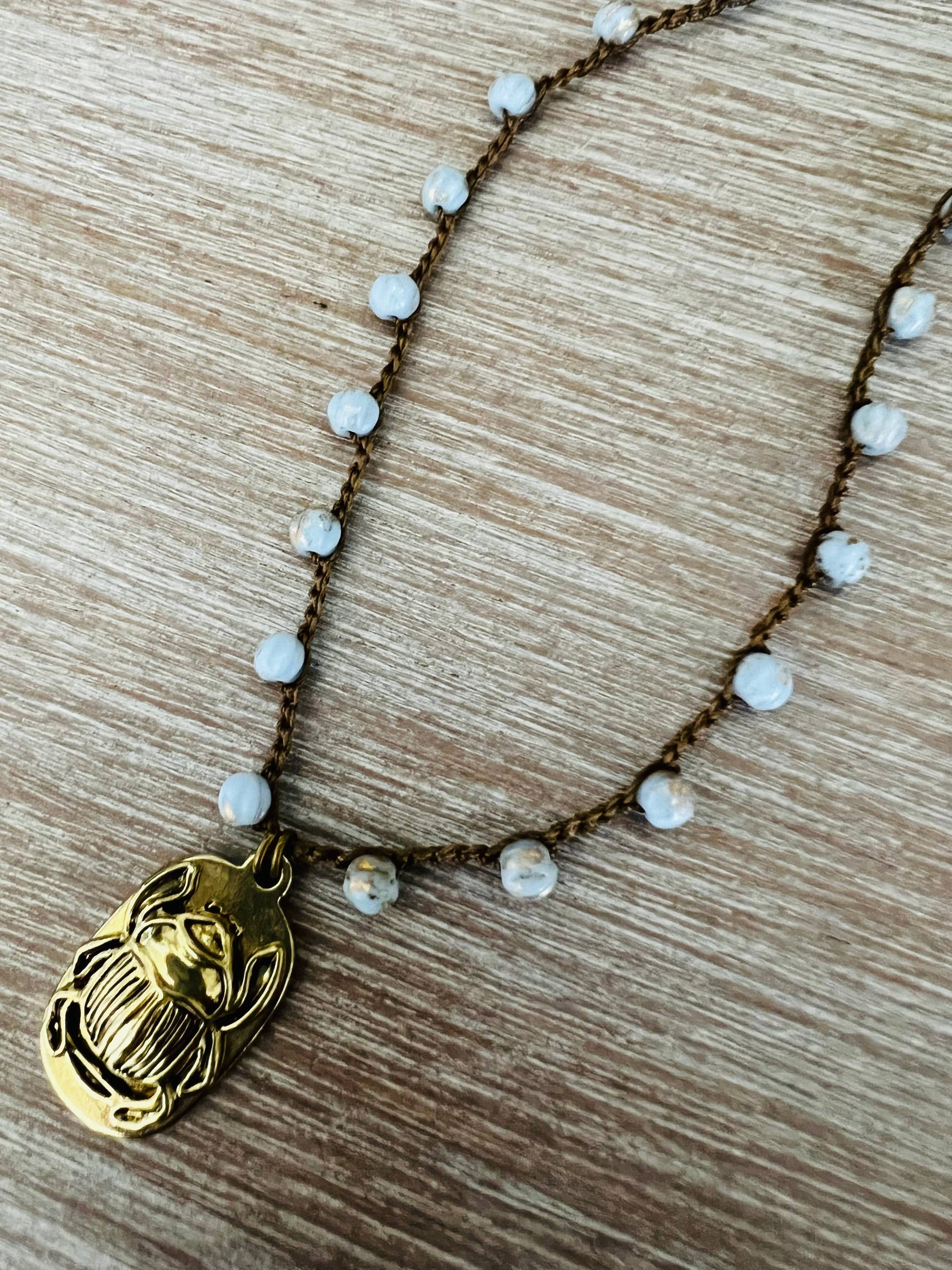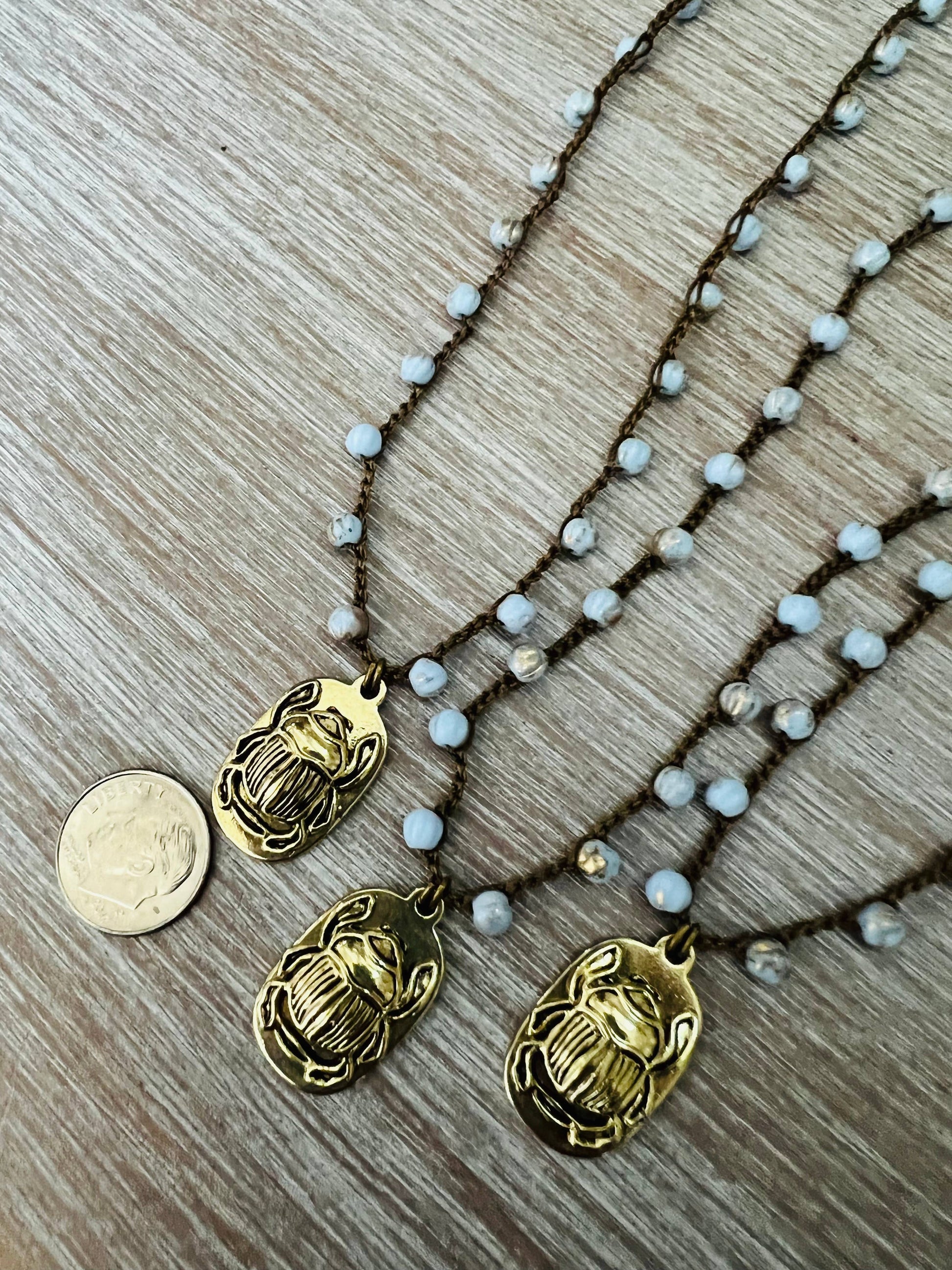 Golden Scarab Charm Necklace With Lavender Crystal Strand
