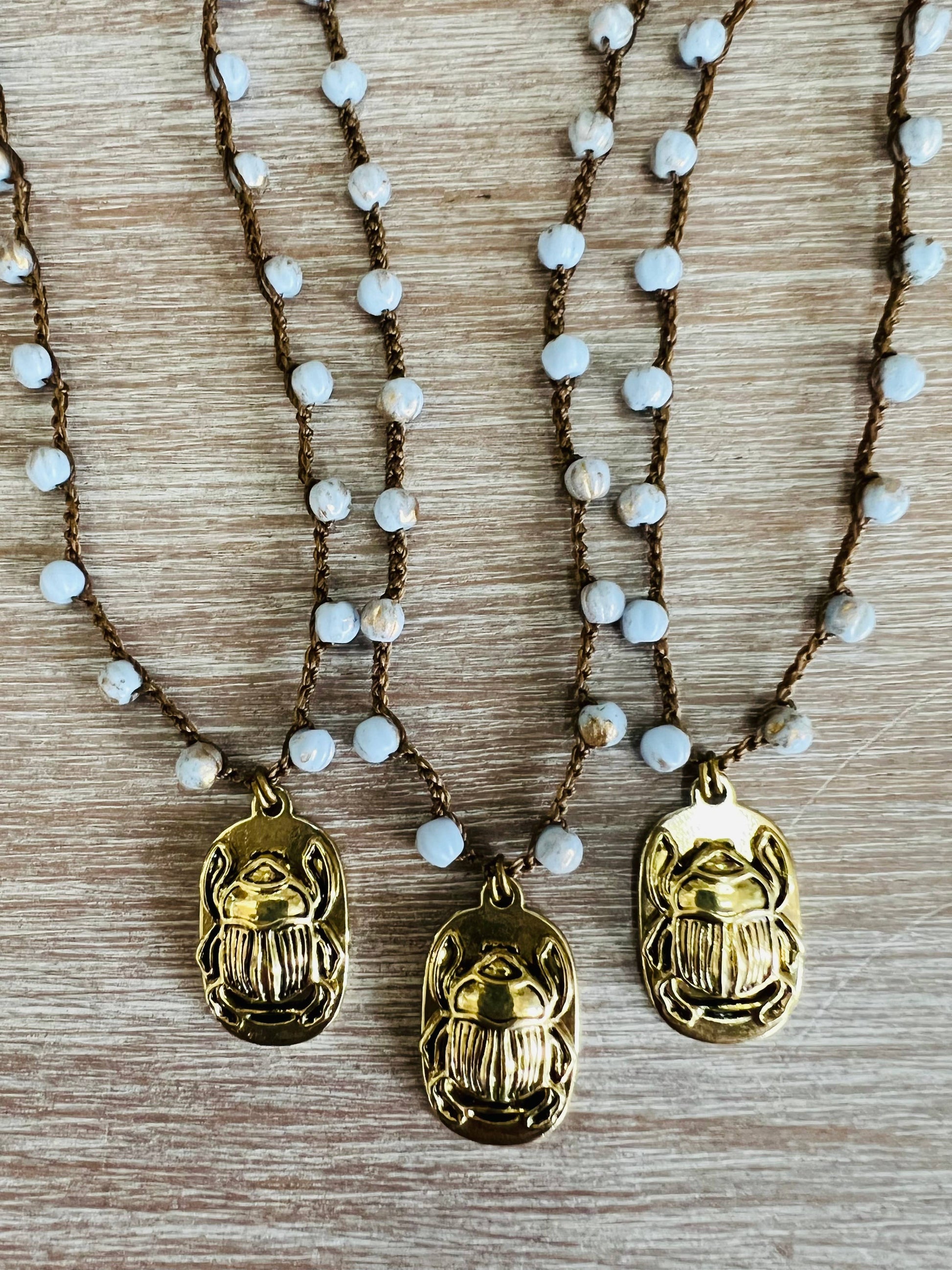 A great piece for layering, this mid length necklace is 20” long and features a soft lavender, fluted glass crystal that has just the slightest shimmer to it. The golden scarab is crafted of pewter and shines like a sweet bit of treasure. Mother of pearl button and loop toggle closure.
