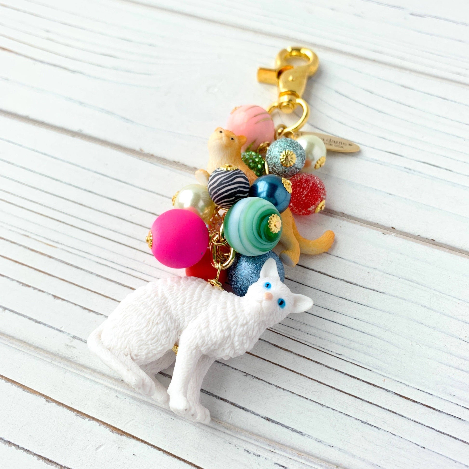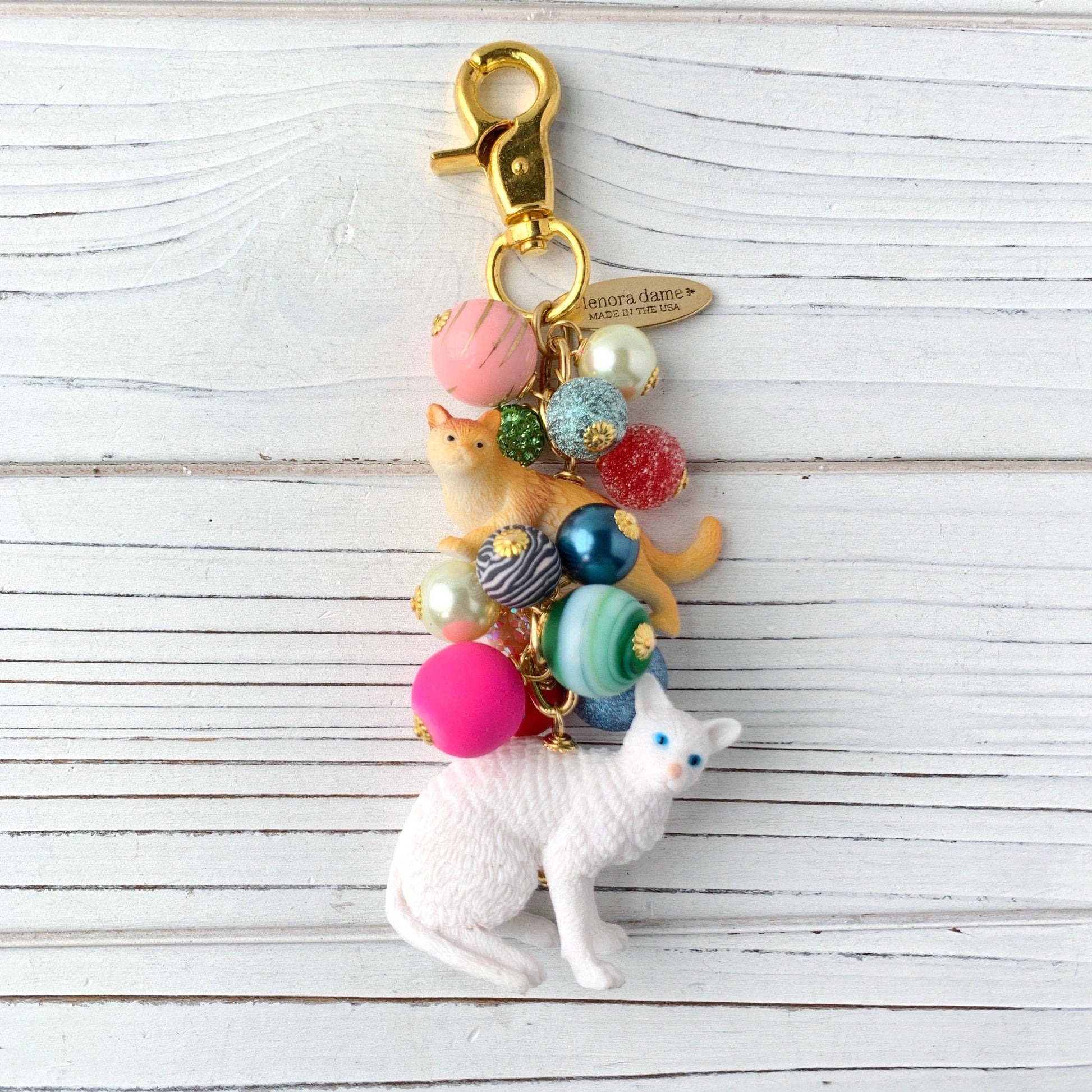 Quirky and unique purse bag charm for the cat lady who loves to accessorize to the fullest! Two miniature cats are hard at work looking cute on this keychain full of a colorful arrangement of dangling bauble beads. An eye-catching and interesting mix of textures and designs including, zebra Fimo, acrylic iridescent pave, a red bead that looks as if coated in ice (very interesting), and a little sparkle and shimmer with the rhinestone pave.