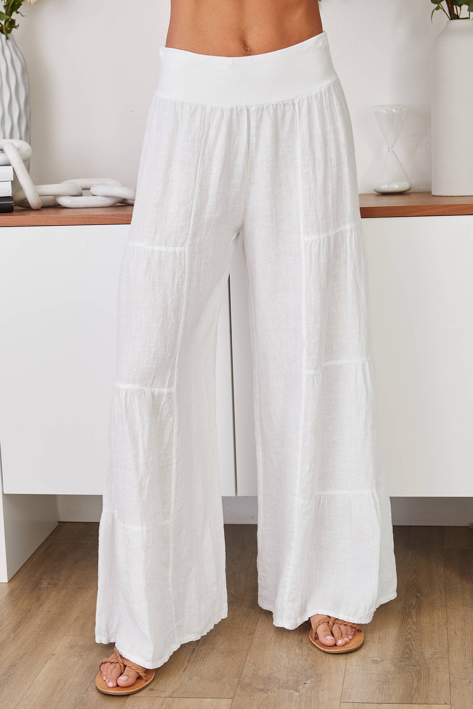 ITALIAN LINEN TIERED PALAZZO PANT BE COMFORTABLE AND STYLISH WITH THE ITALIAN LINEN TIERED PALAZZO PANT.