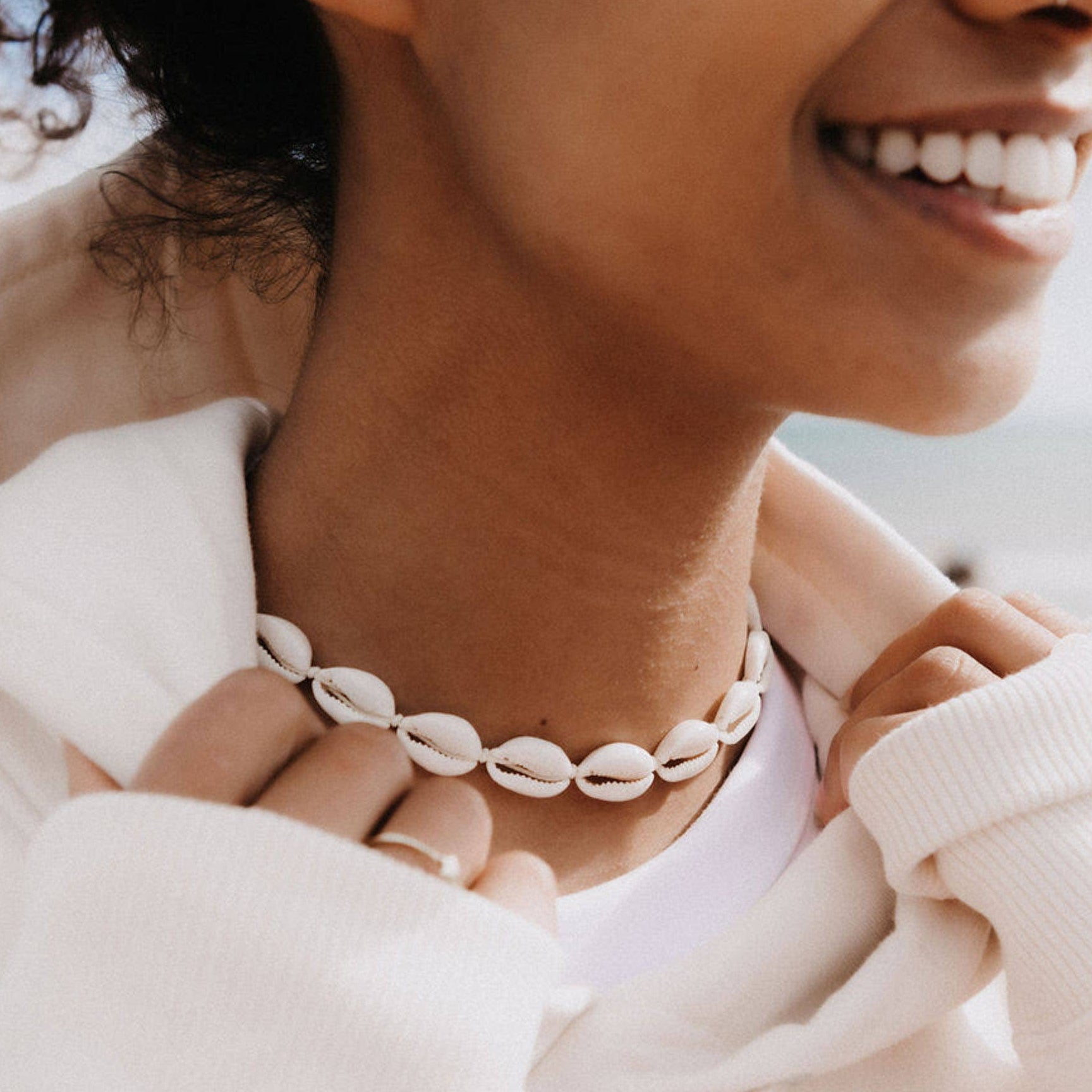The surfer girl handmade necklace features real cowrie shells woven together with silk string. A handmade cowrie shell choker design.