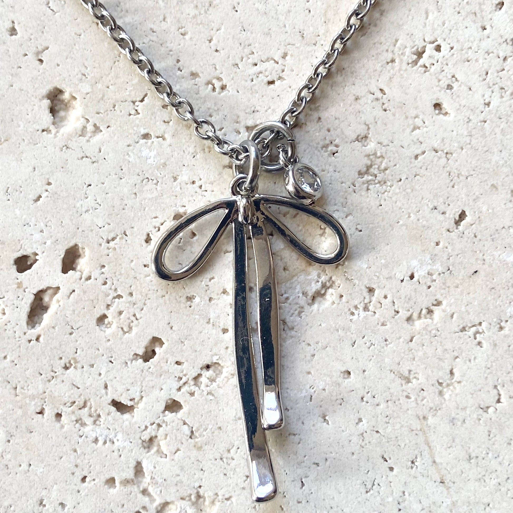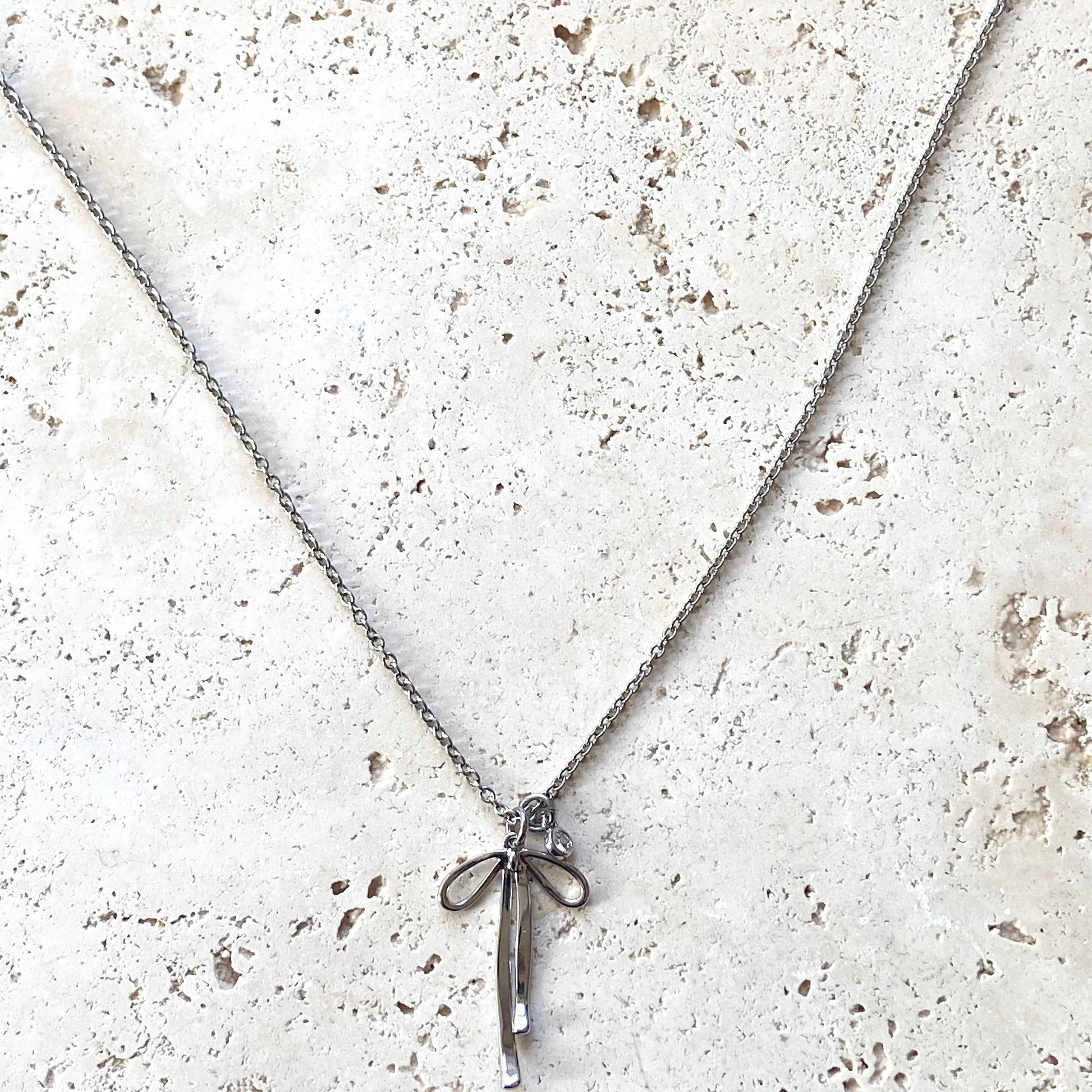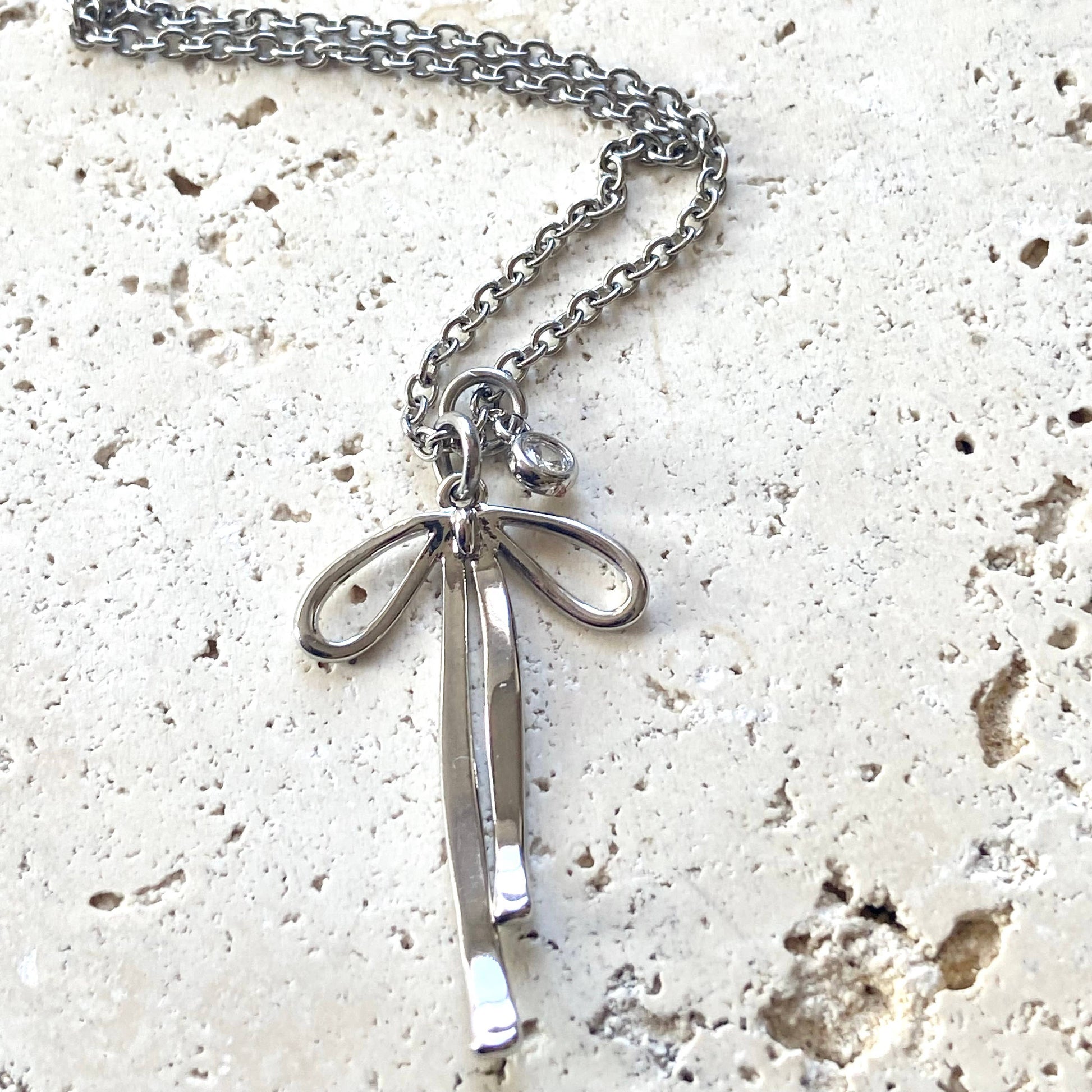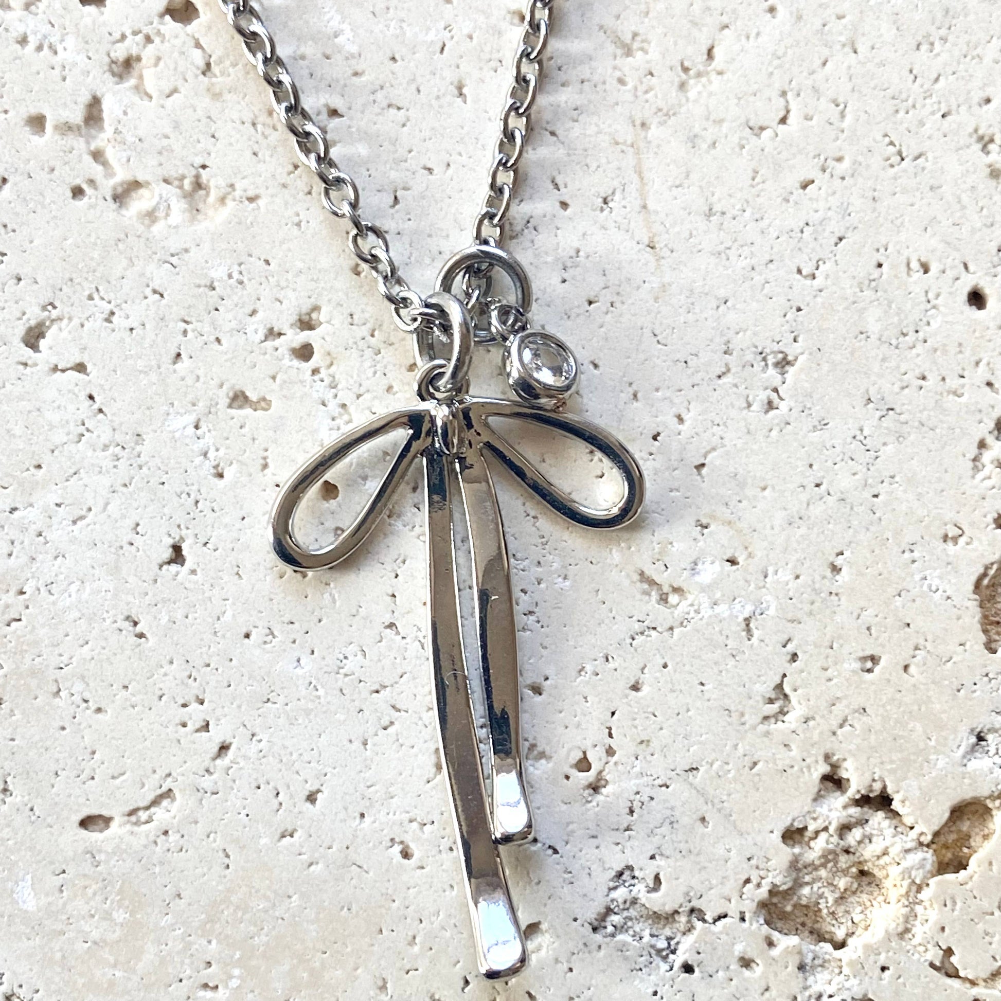 How cute and trendy is this bow / ribbon necklace? It features a tiny sparkly, clear, crystal bonus charm Stainless steel non tarnish chain