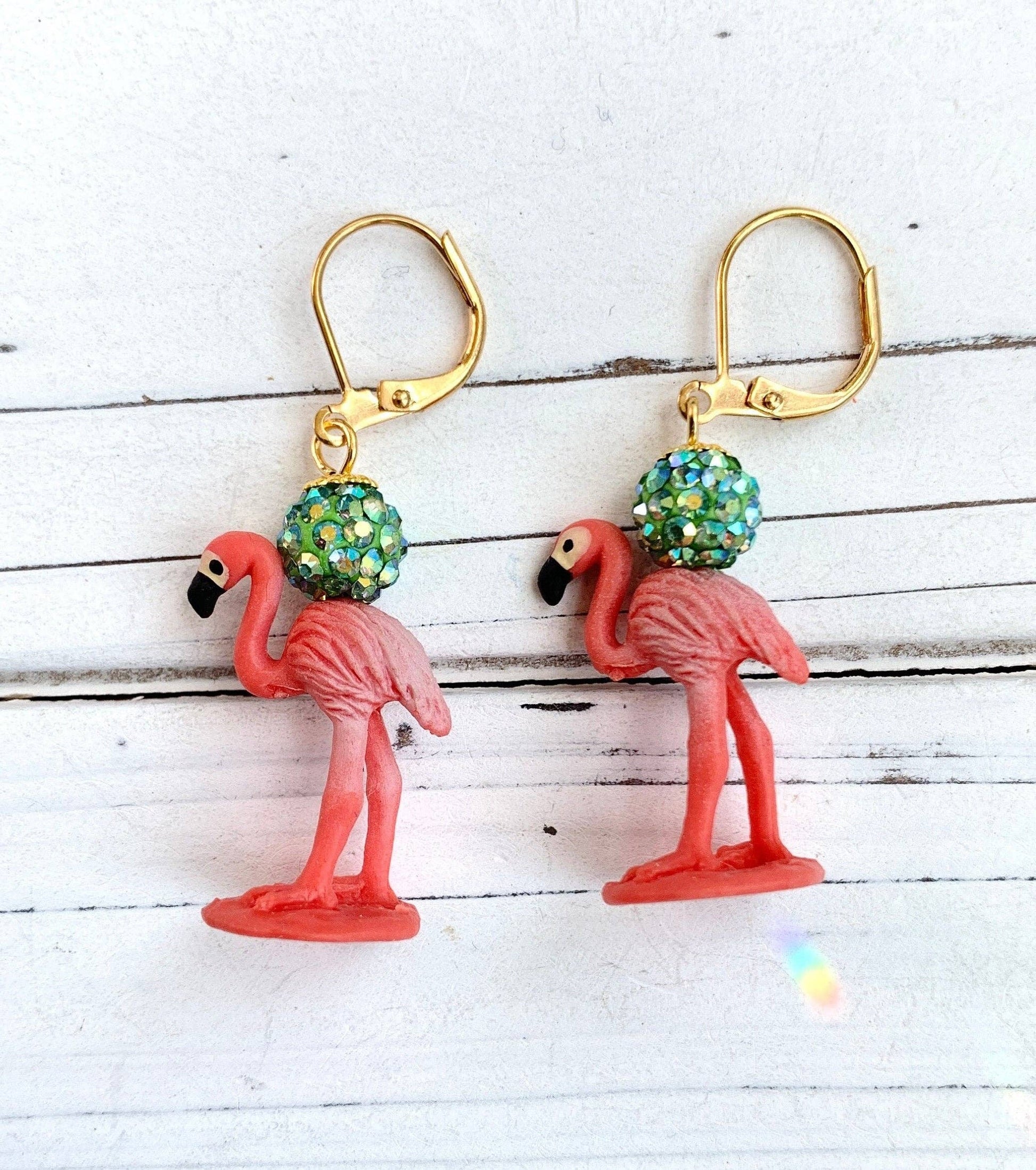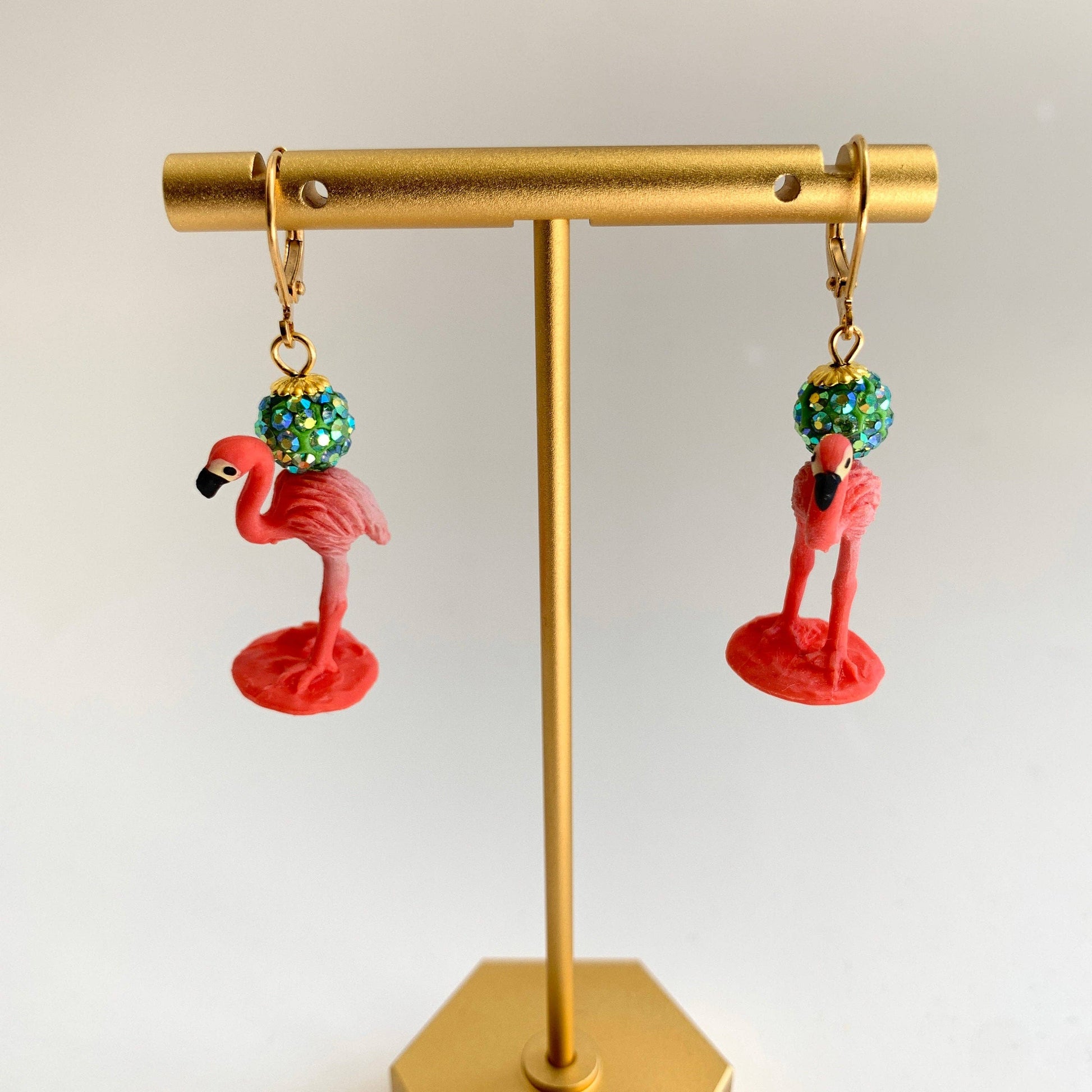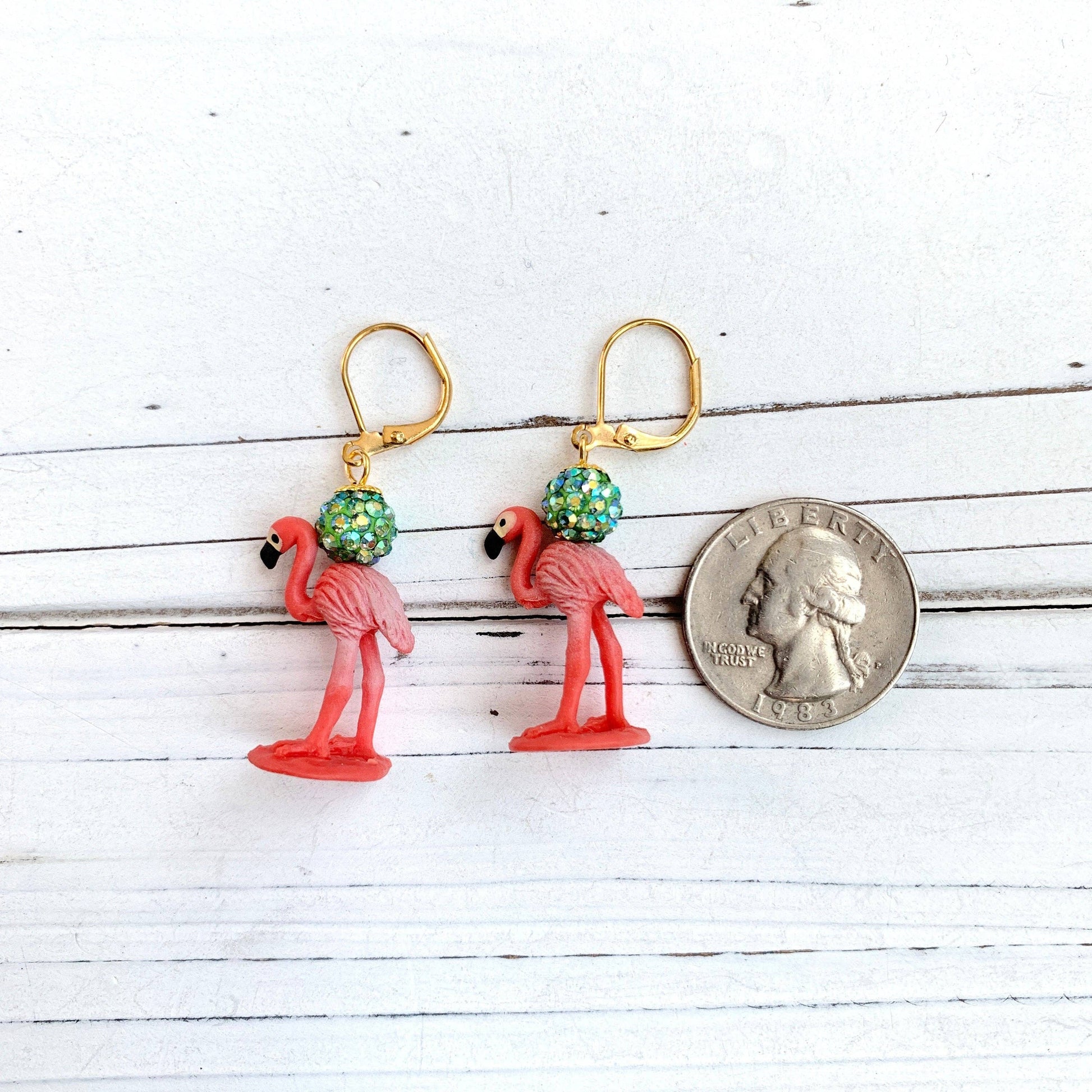 Cute miniature flamingo earrings with shimmering rhinestone pave beads. Lightweight earrings with miniature resin flamingo figurine to complete your resort style. Perfect flamingo gift for flamingo lovers.