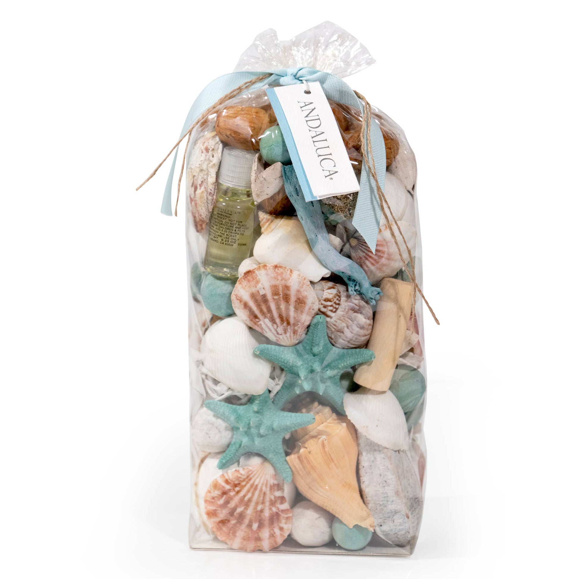A coastal favorite with natural driftwood and seashells in a light summer blue.