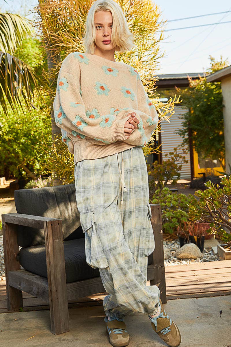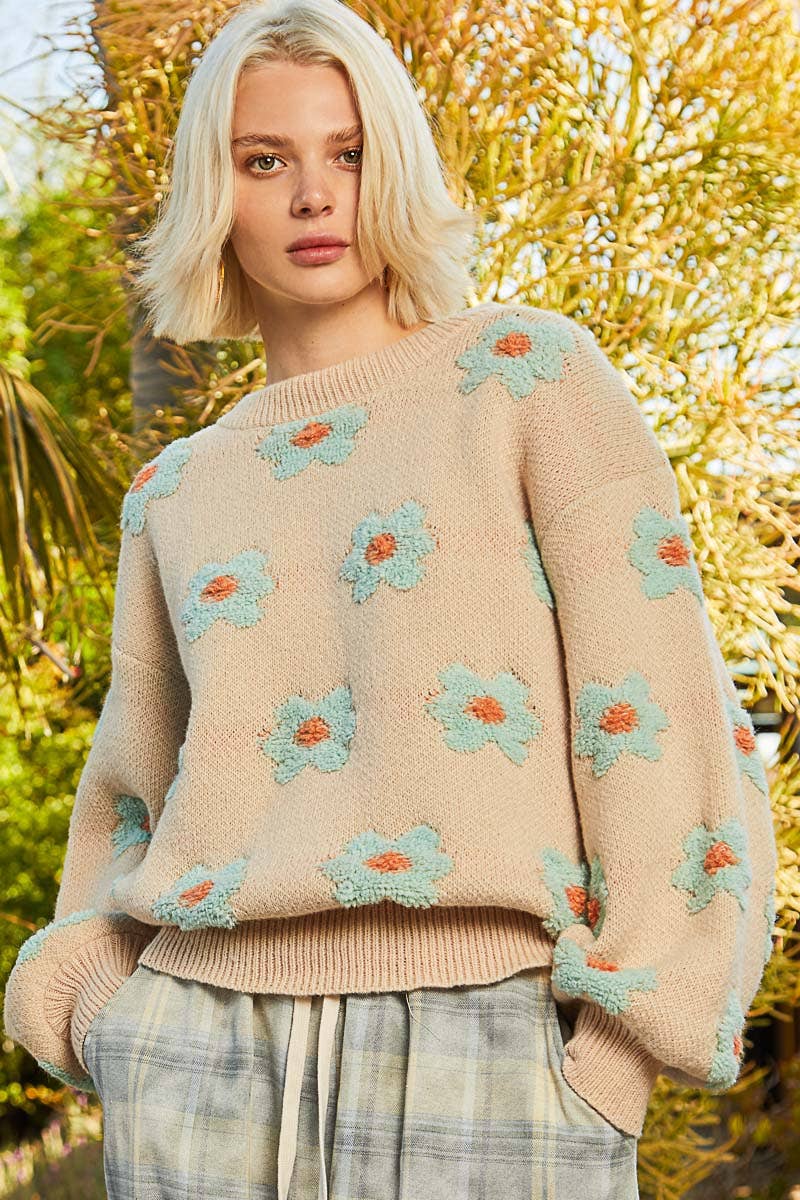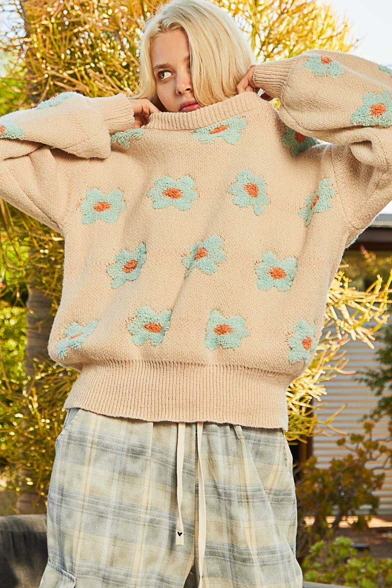 Toasted Almond Oversized Round Neck Daisy Floral Sweater
