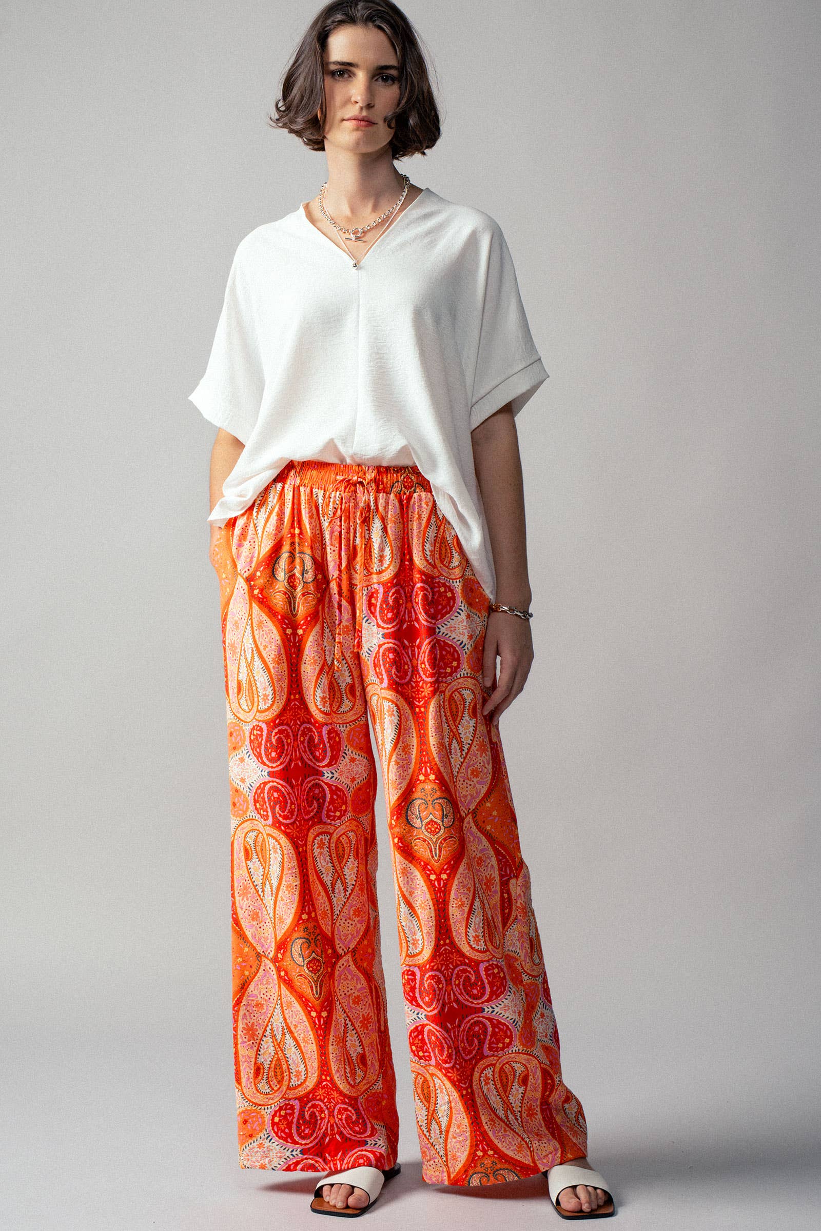 These vibrant wide-leg pants feature a bold paisley print in fiery orange and red tones, perfect for adding a touch of drama to spring and summer collections. Crafted from lightweight viscose blend fabric, they offer a comfortable elastic waistband for effortless wear.