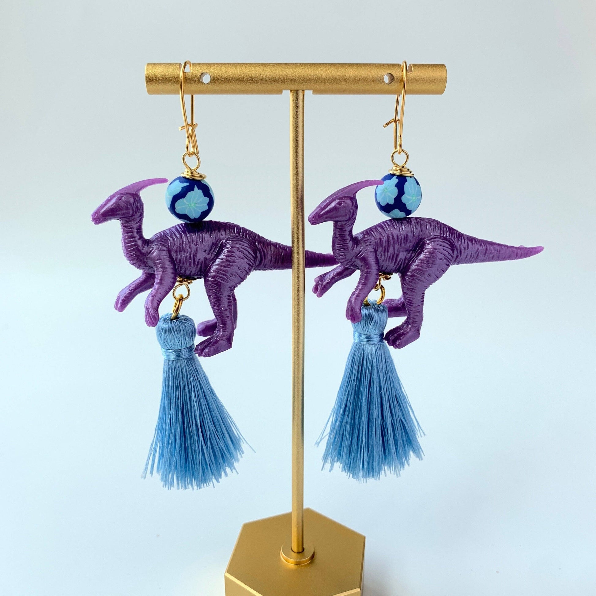 Make a statement with these fun dinosaur earrings with floral fimo beads and silky ski blue tassels. Gold-plated, nickel-free ear wires. 3.5"L.