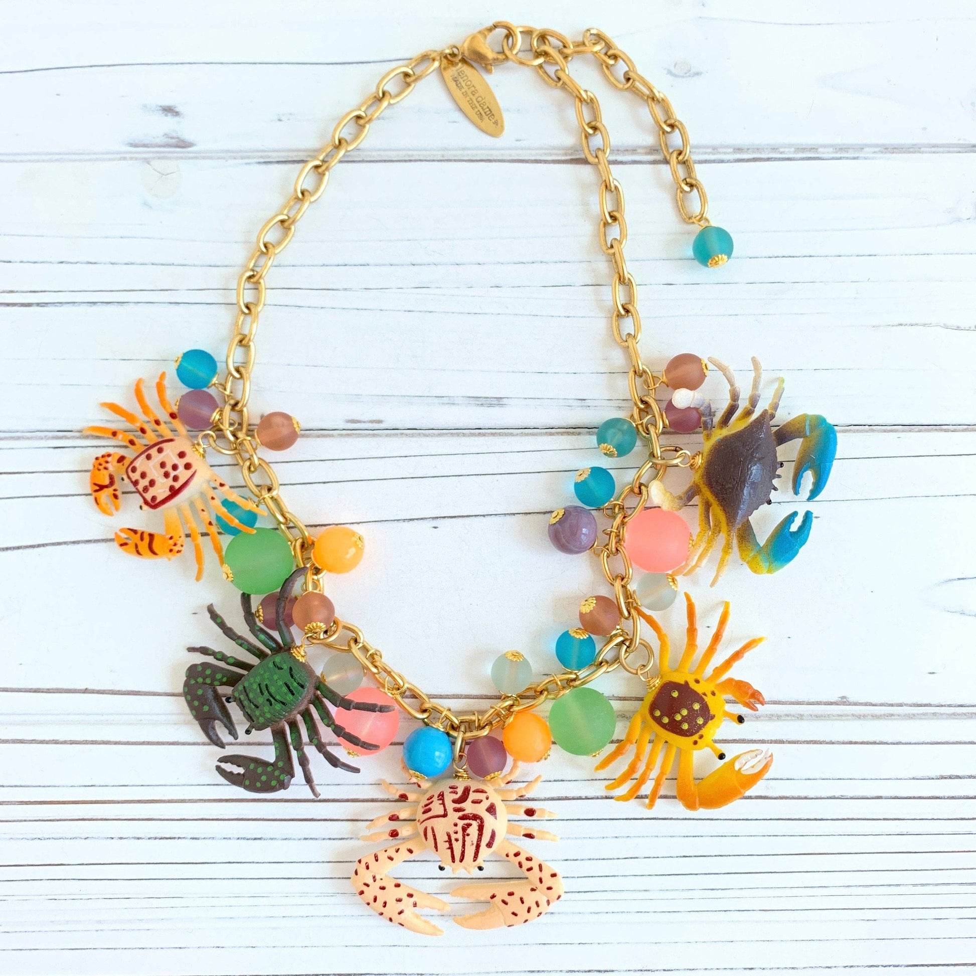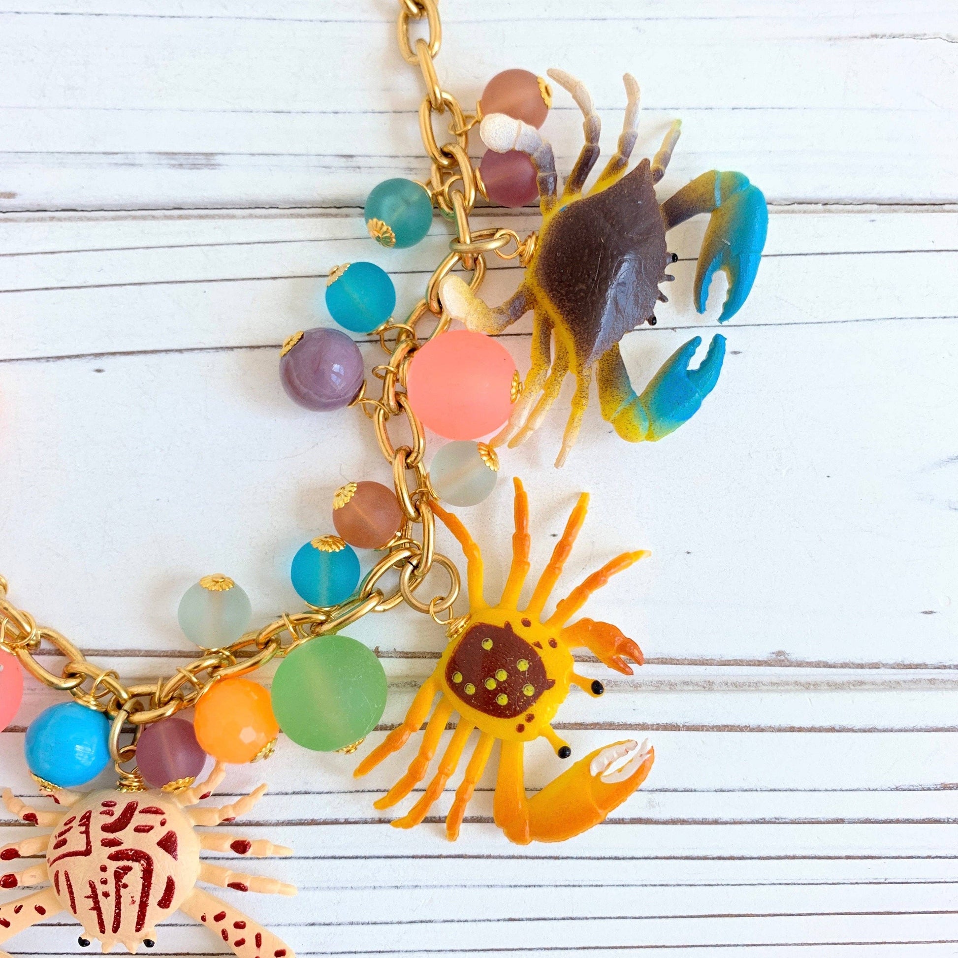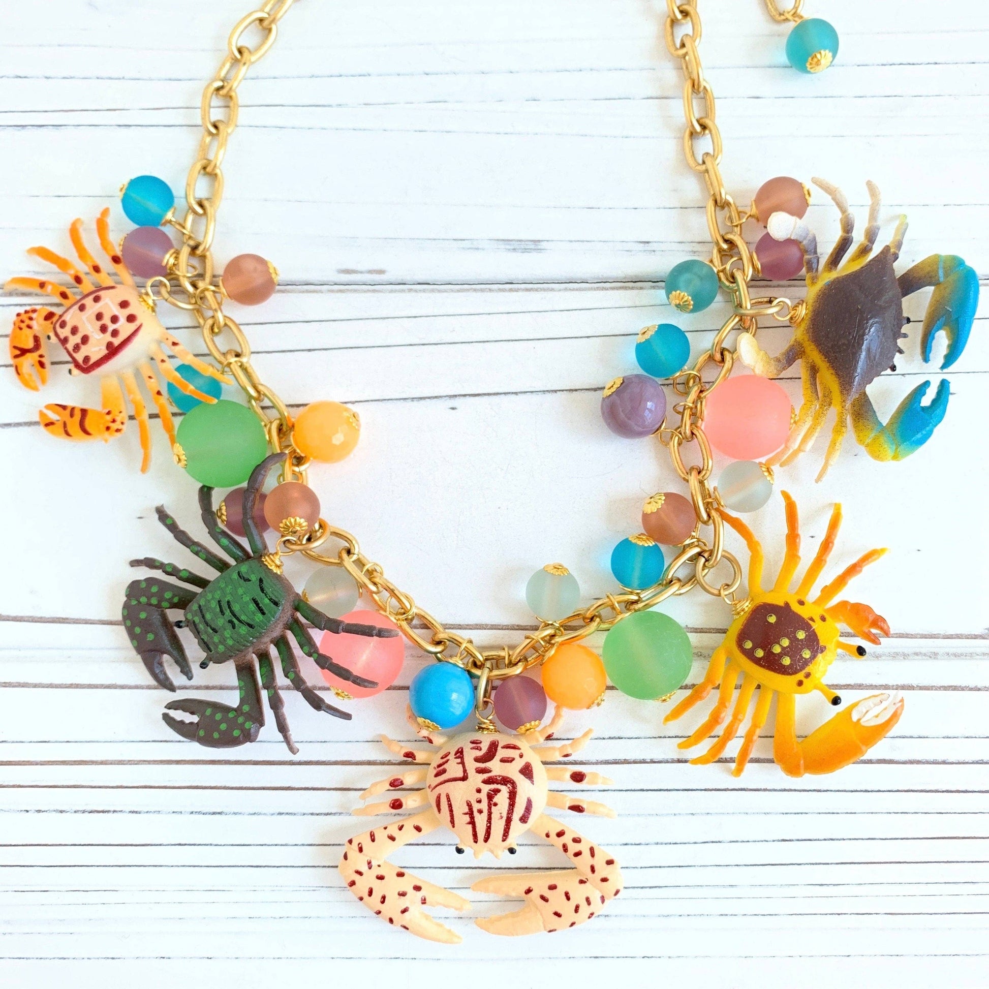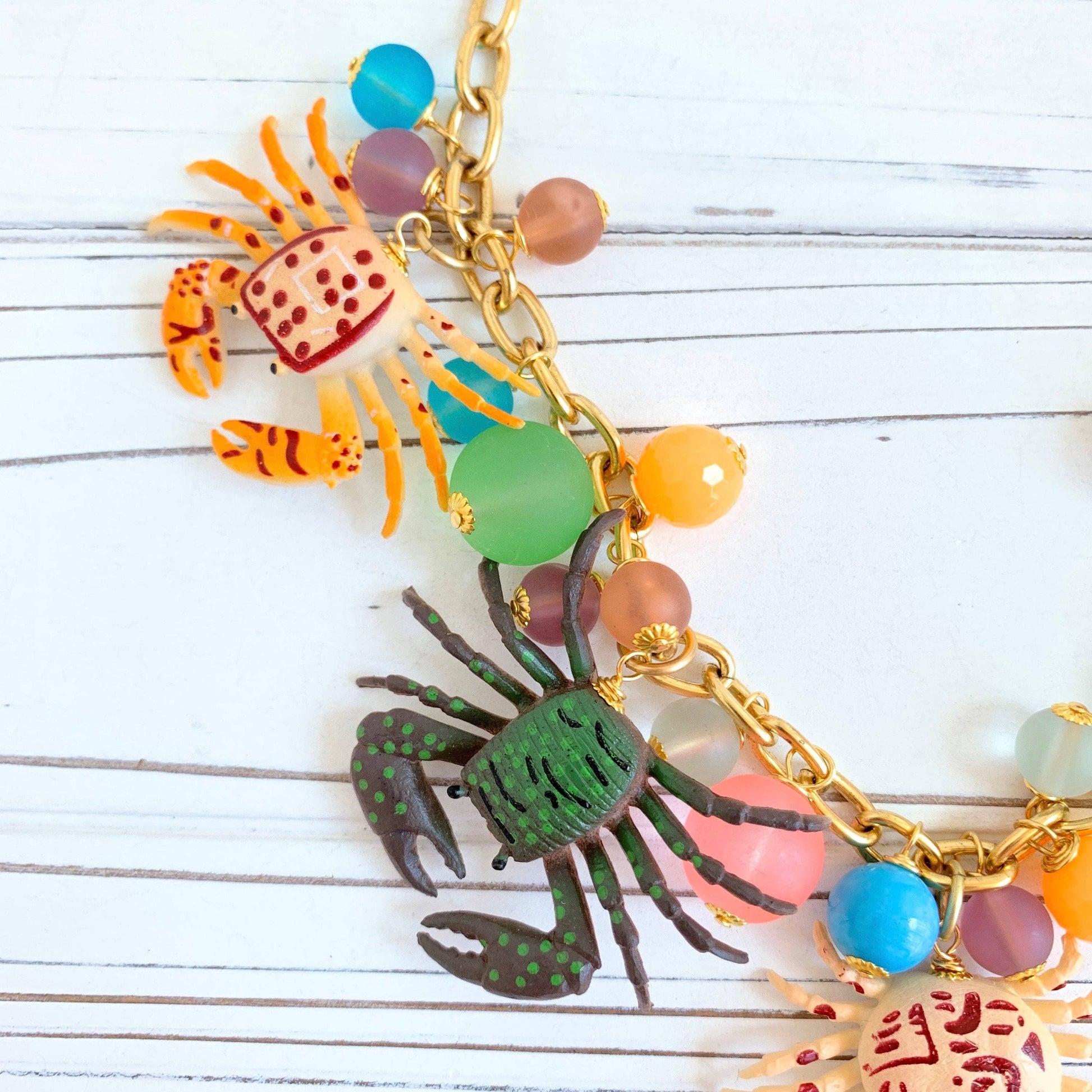 Make a big splash with this fresh new vacation-ready crab necklace. Beads that look like sea glass in bright uplifting colors and playful resin crab charms create one fun summer necklace.