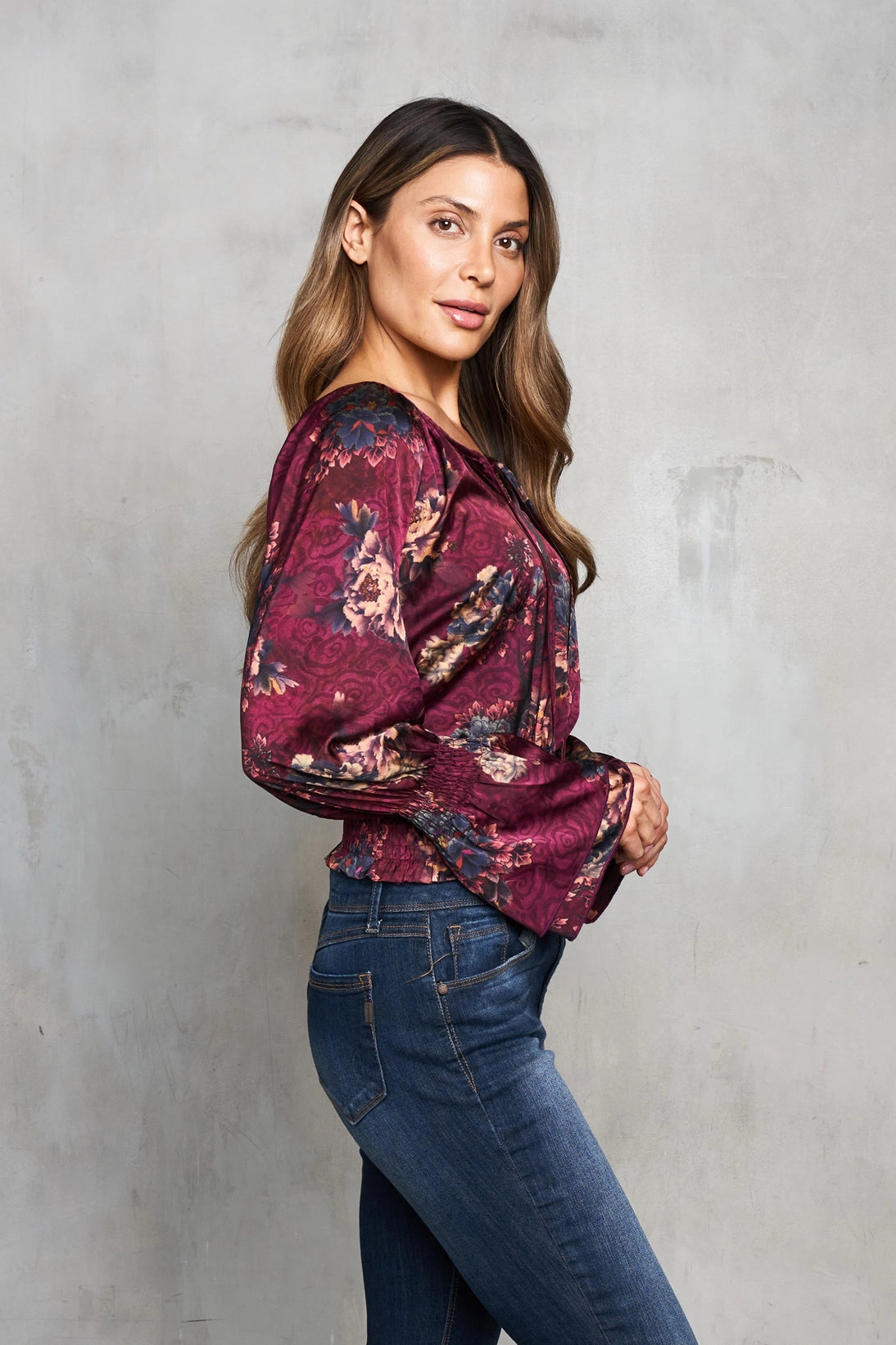 This Satin Verona Print Peasant Top w/ Smocking is a true embodiment of romantic whimsy.