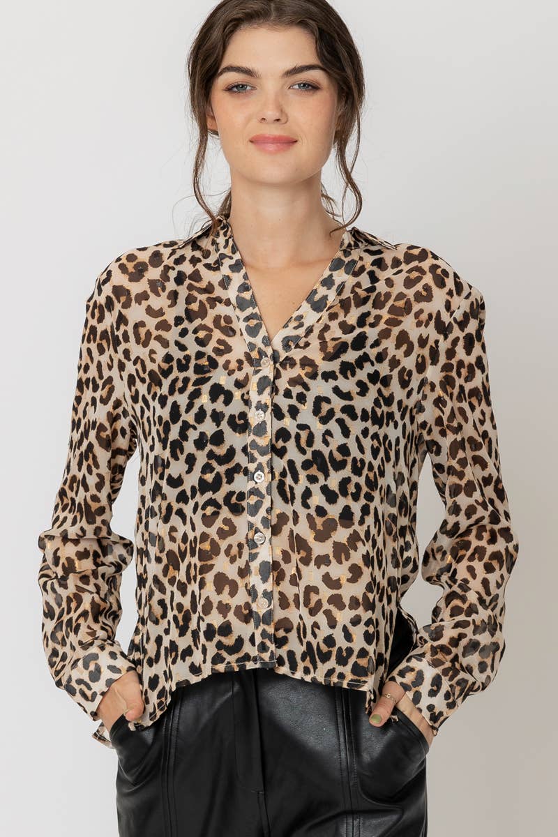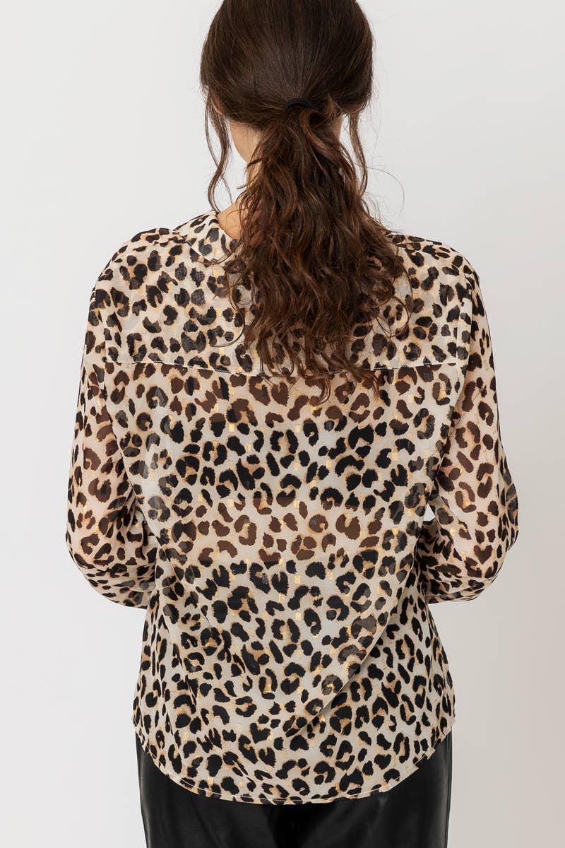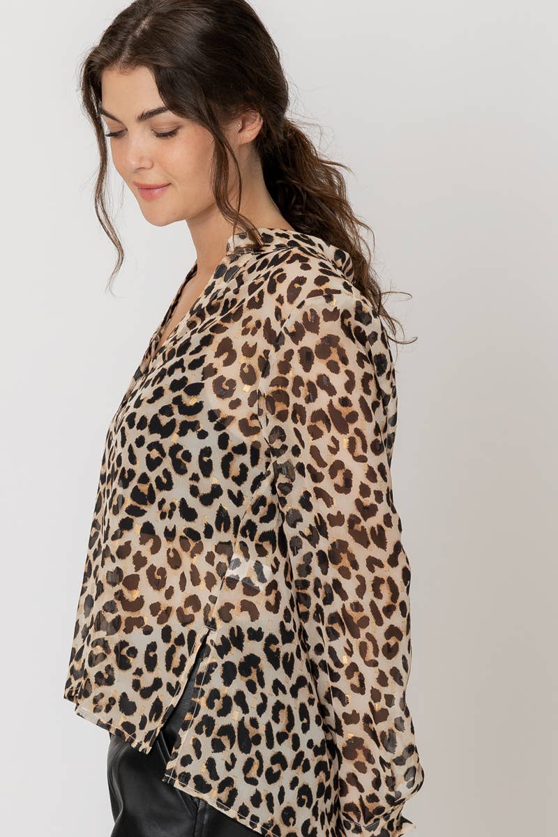 Sheer Leopard Print Button Down Blouse with Lurex