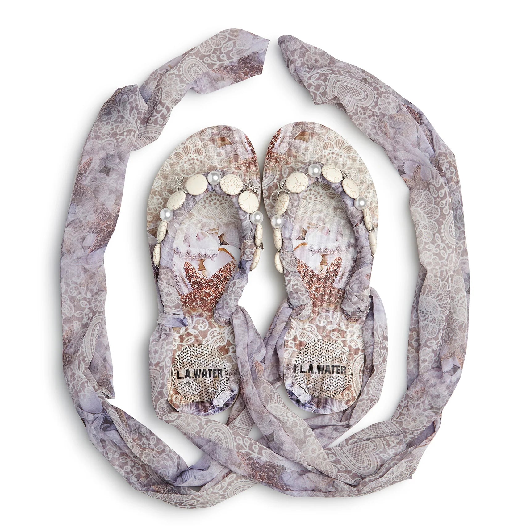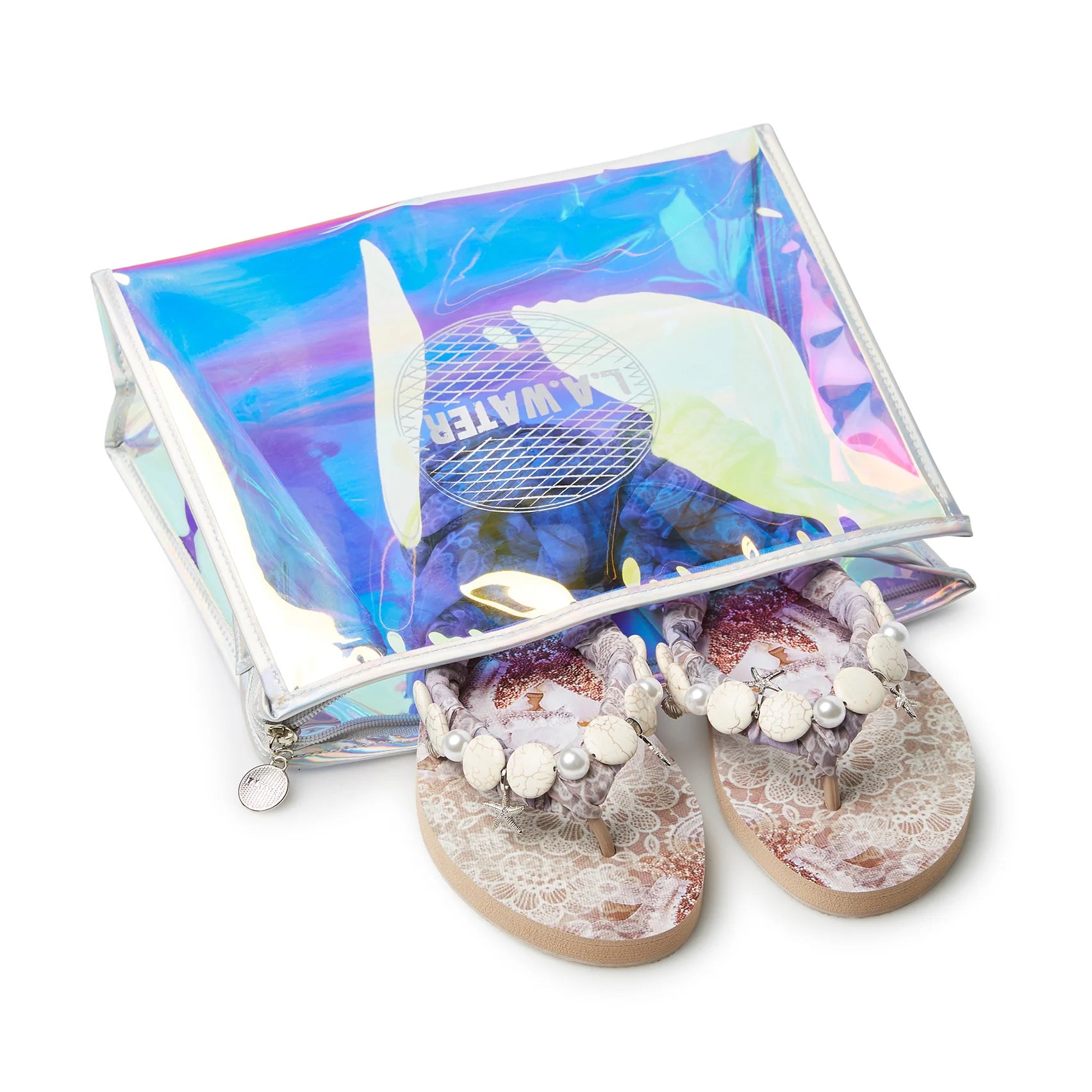 Packaging: The slippers are eloquently packaged in practical pouches made in mermaid pic and all possess the L.A. WATER logo. Every pair is endorsed with glamorous accessories to wear both at the beach or in the city.