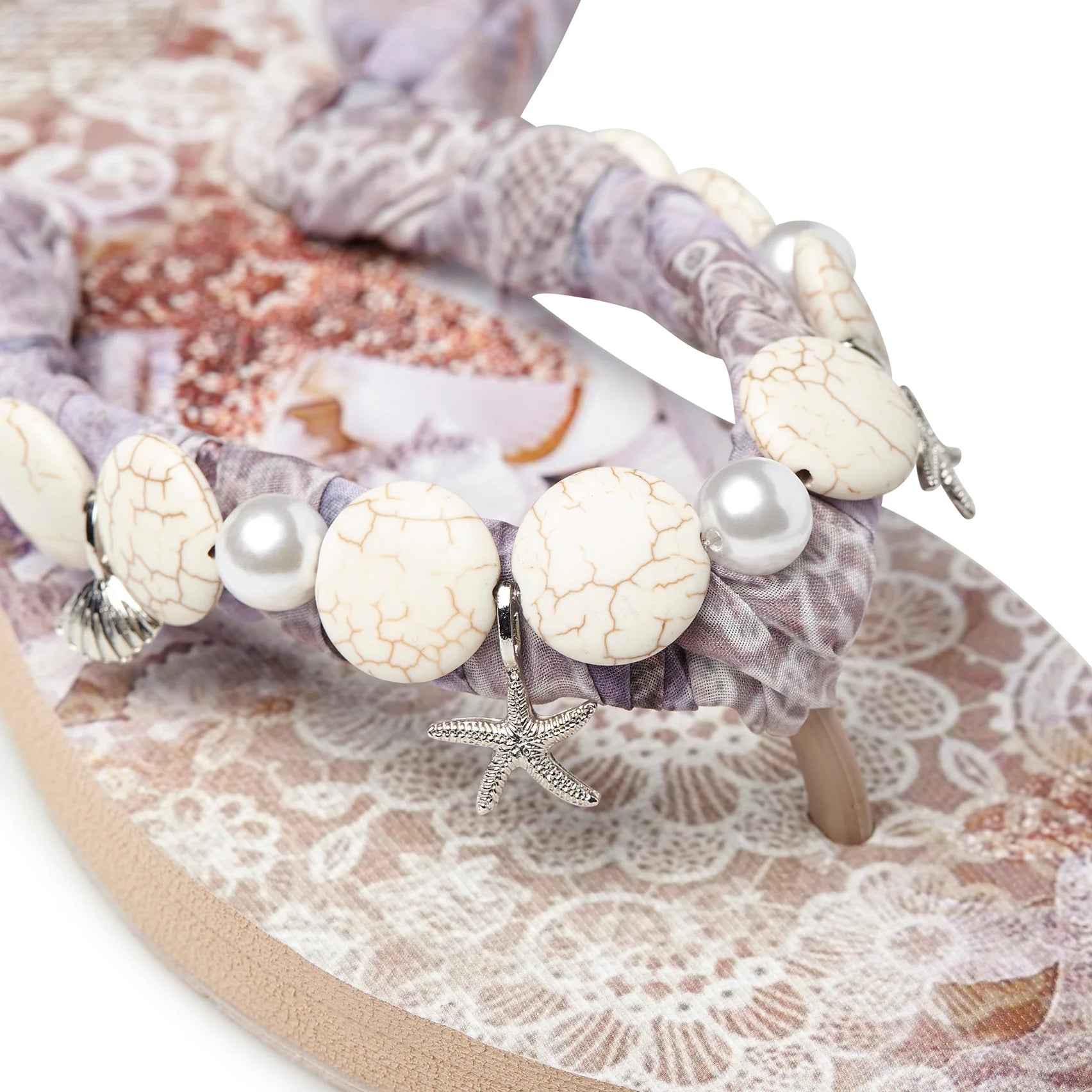 The straps are beautifully accessorized with cream stones and pearls, adorned with mini silver pendants of shells, starfish and fish.