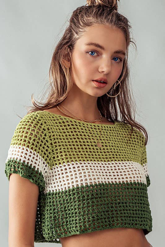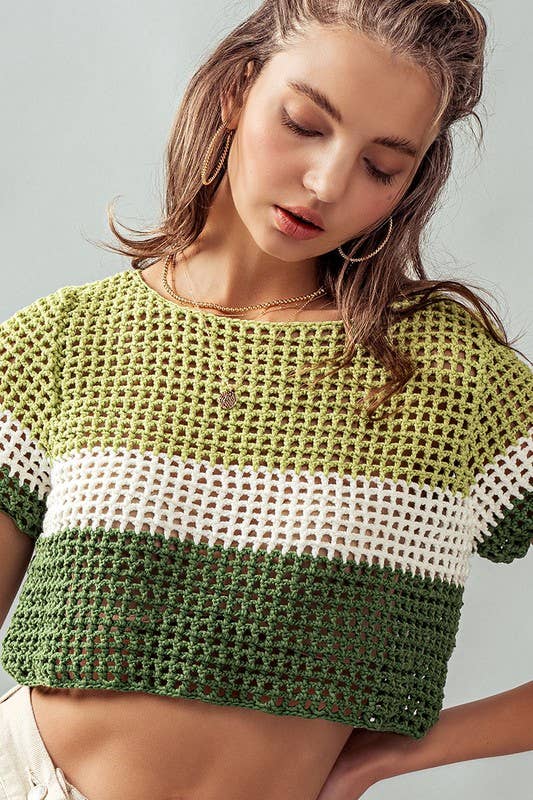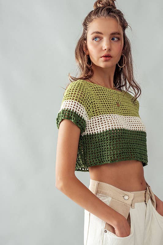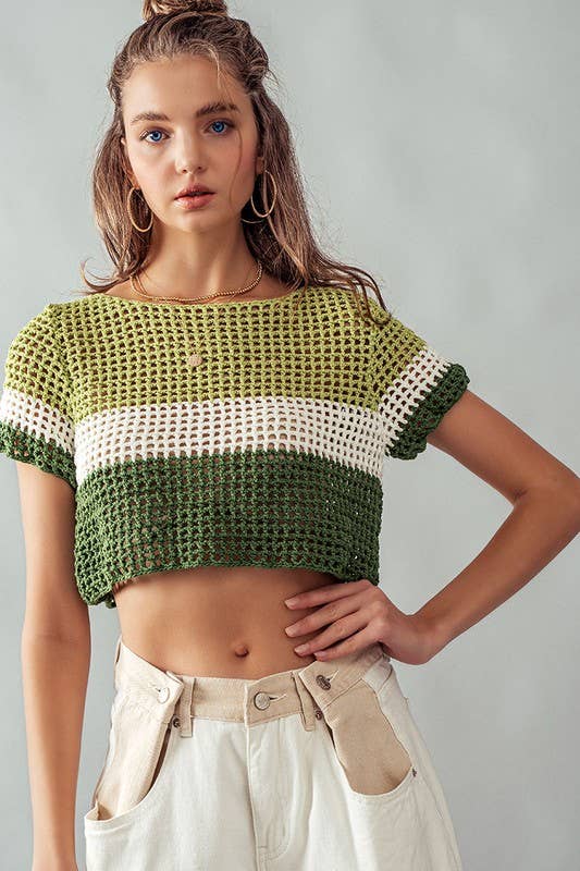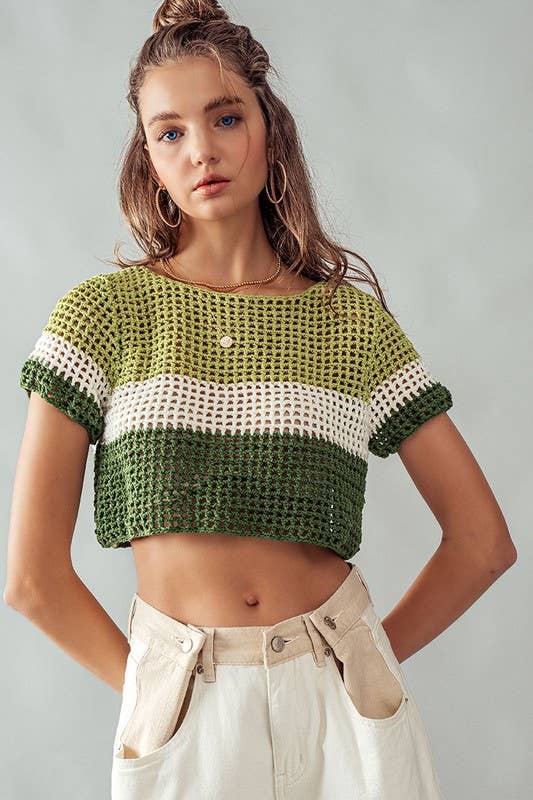 Green STRIPE CROCHET SWEATER CROP TOP
