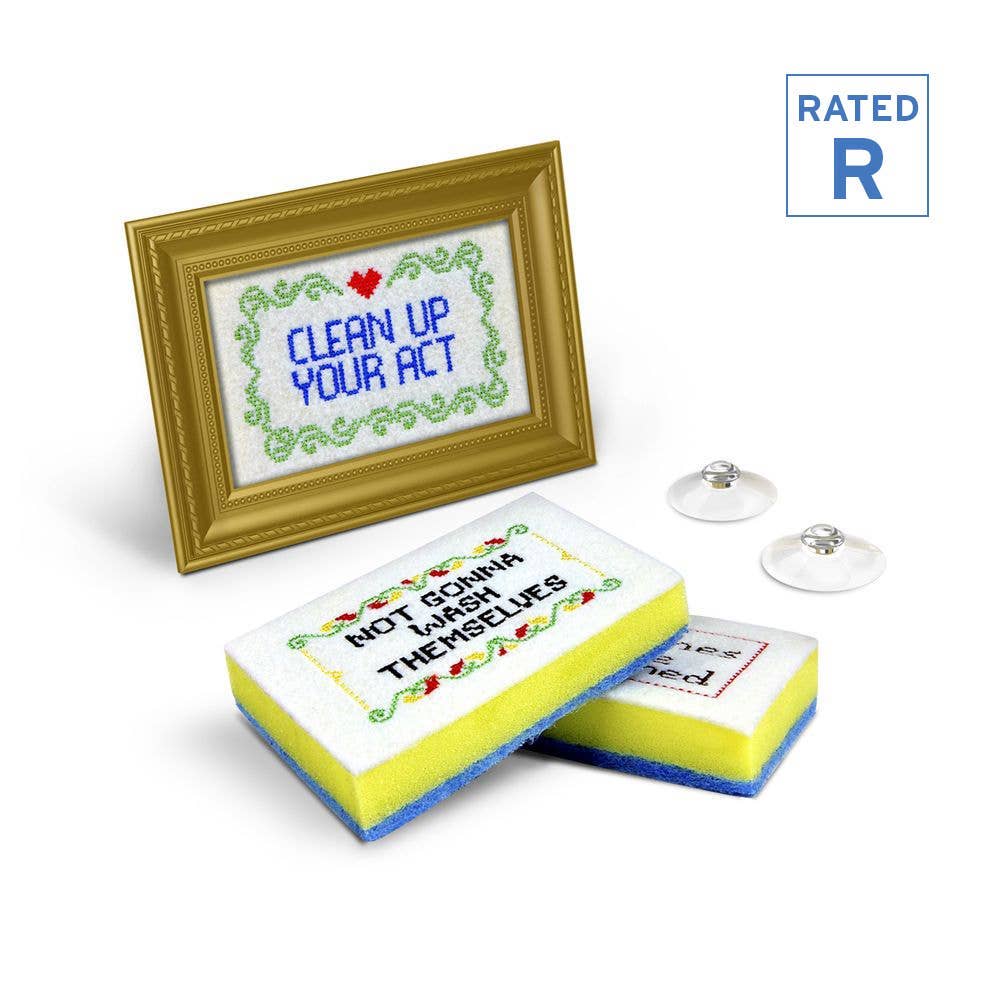 Dishes bring out the surly side in all of us. Show them how you really feel about tedious tasks with Subversive Sponges. Set of 4 unique embroidered poly sponges with a PP gold frame that stands on your countertop or suctions to your sink or tile.