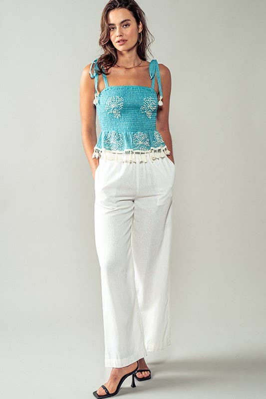 CROPPED RUCHED CHEST FRINGE HEM TANK TOP WITH EMBROIDERING AND TIE STRAPS