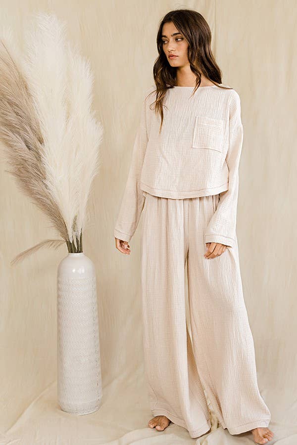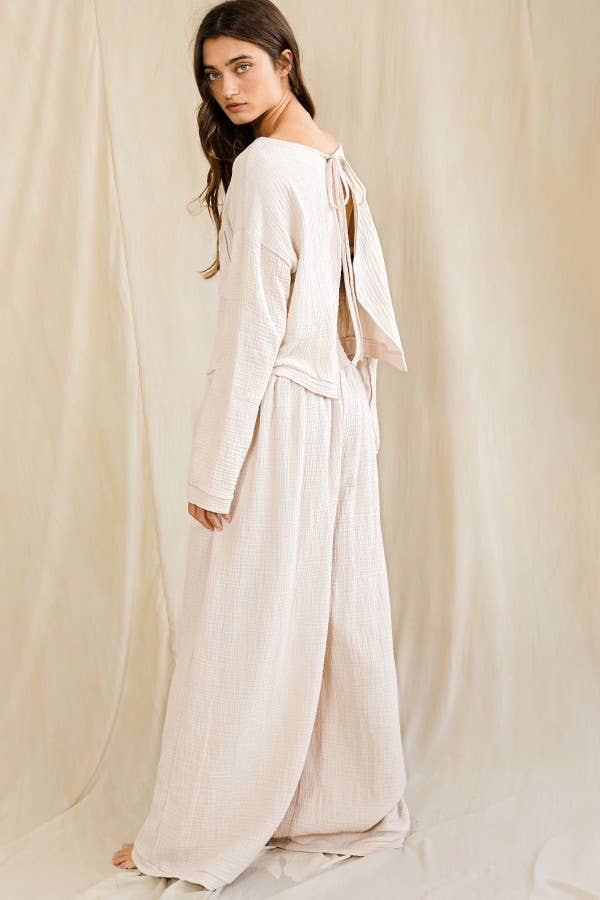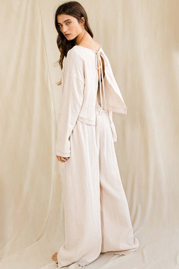 Adjustable tie closure at the open-back - Long sleeve with banded cuffs - Crew neckline - Chest pocket - Rounded hemline - Cropped above the waist