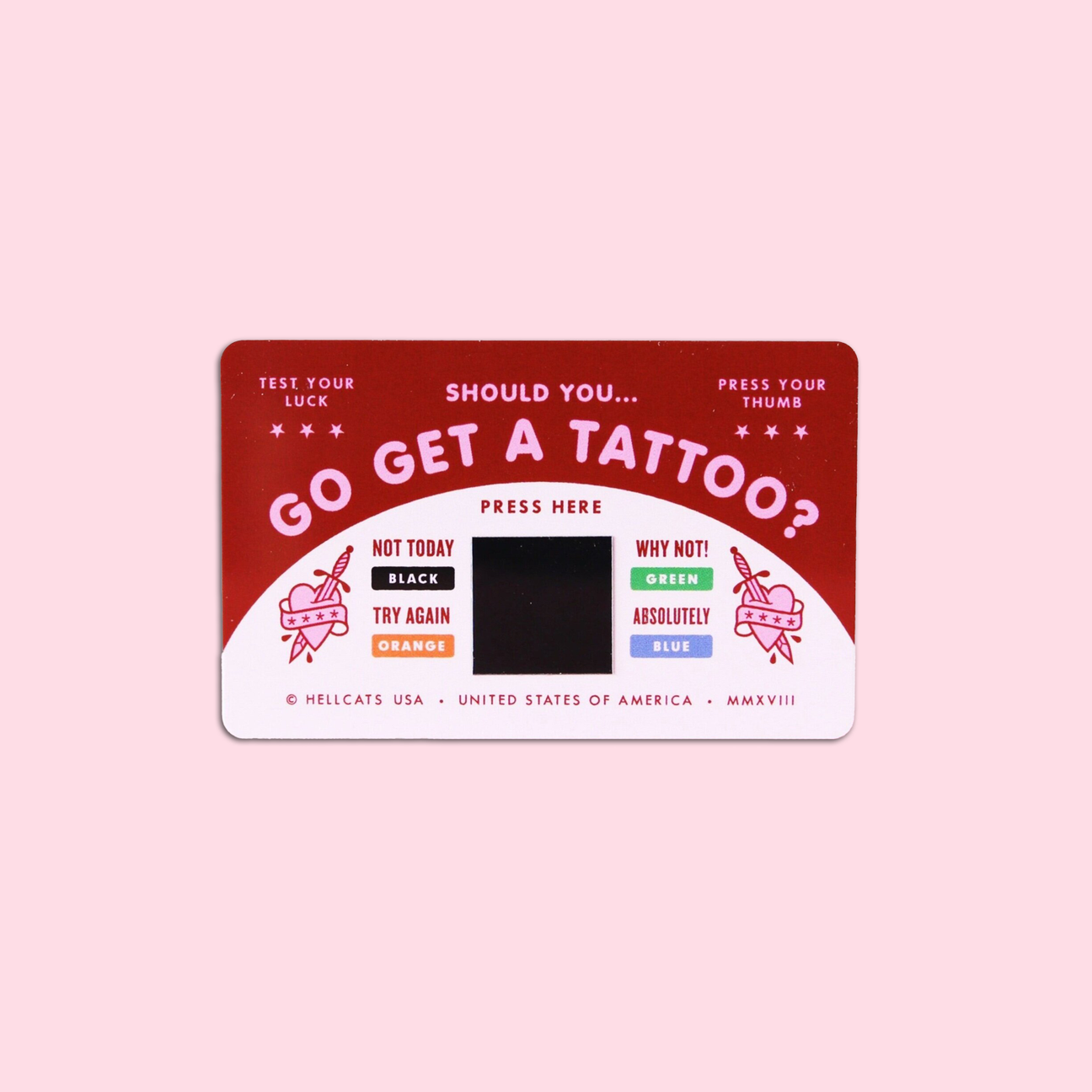 Should you get (another) tattoo? Place your finger on the card for the answer. Credit card sized, to fit in your wallet. Reverse side can be used as a spinner to determine who will pay for the next drink, or whatever else!