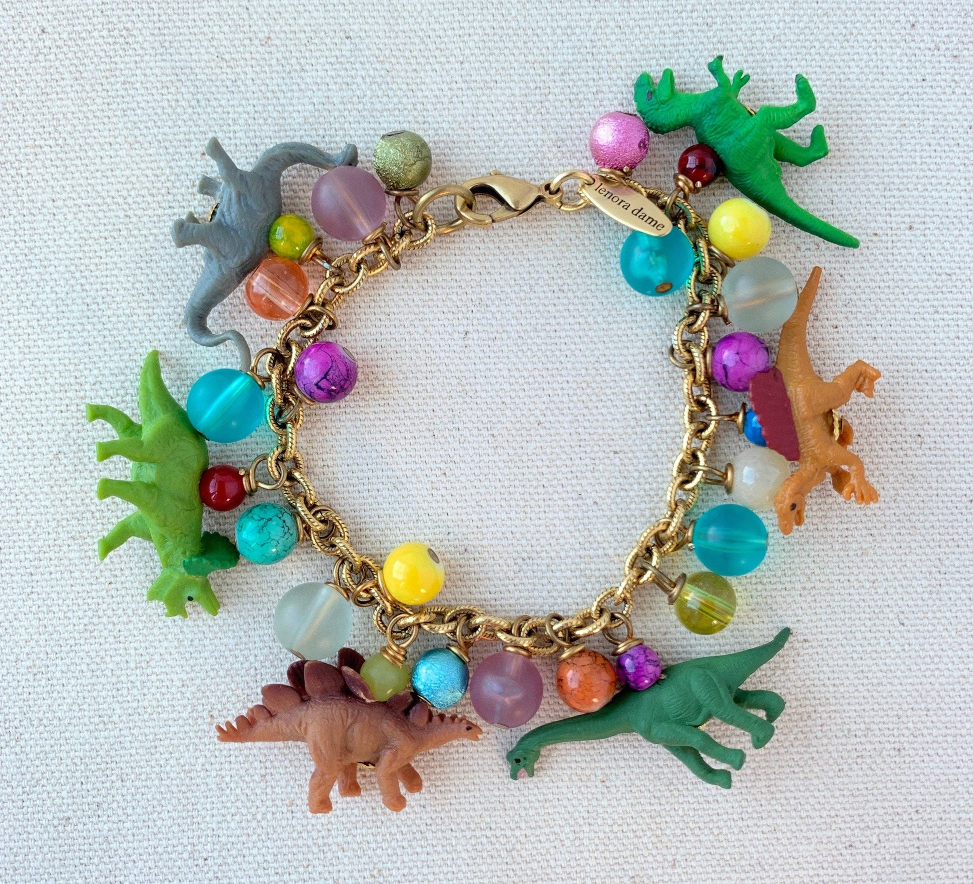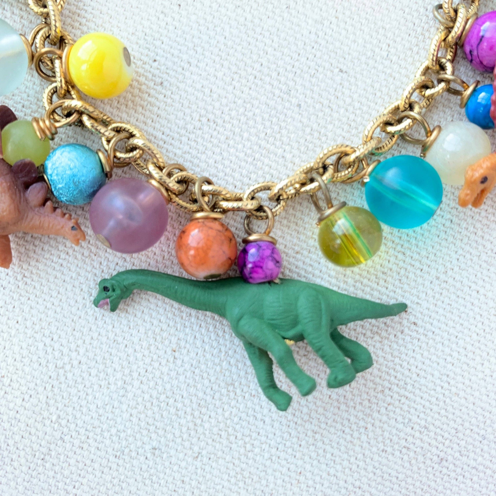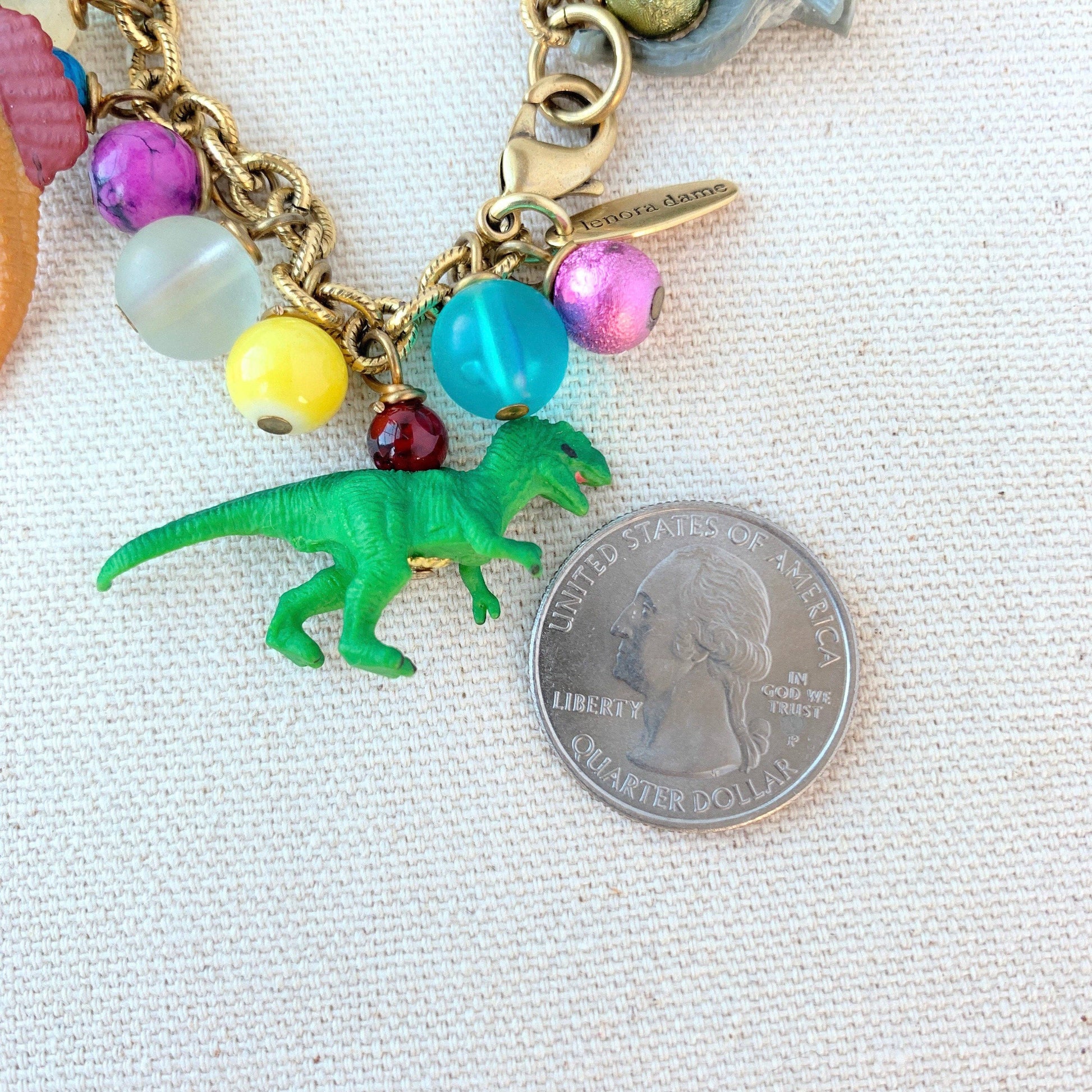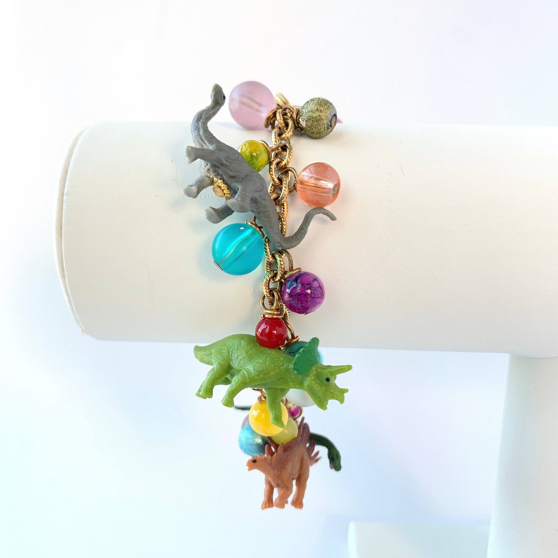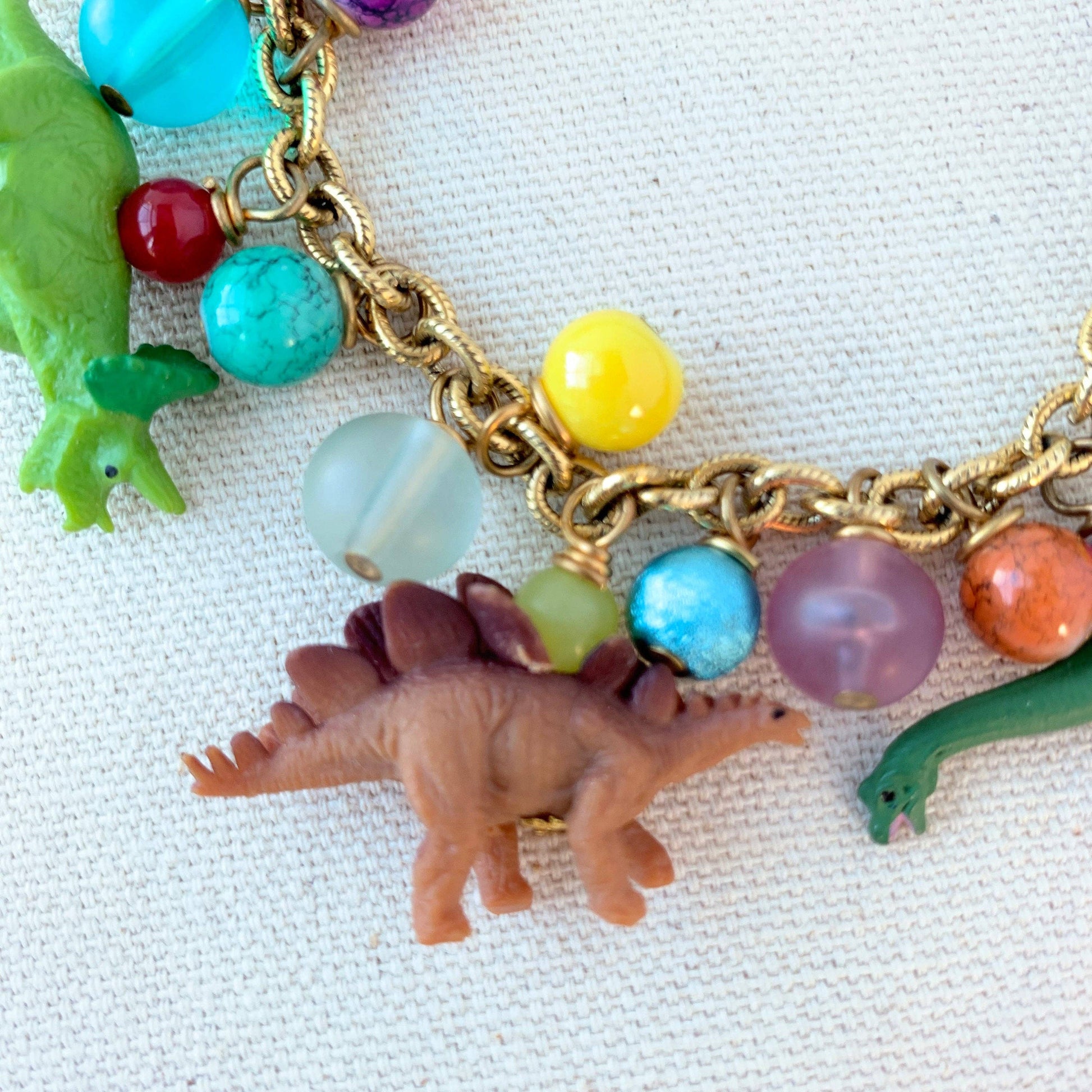 Tiny dinosaur charms and colorful beaded charm bracelet. A wild accessory for dino lovers. 8"L.