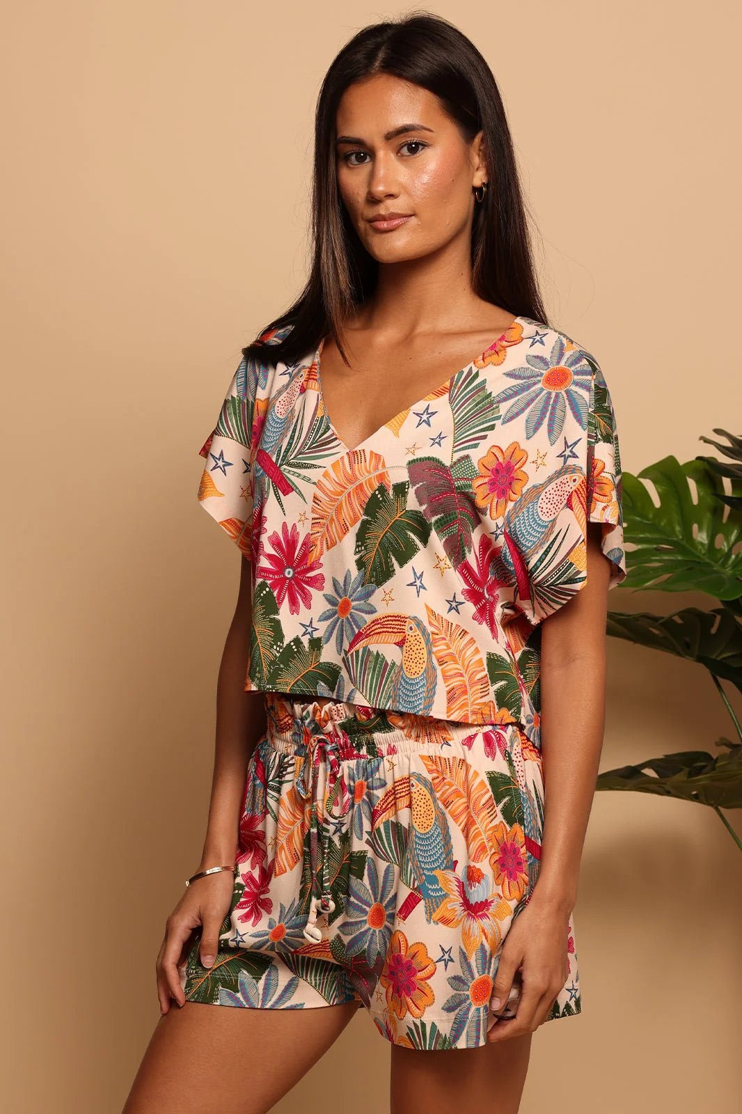 Introducing our women's Paperbag Shorts, perfectly designed for comfort and style. These shorts are adorned with a vibrant tropical print featuring illustrated toucans, bringing a touch of paradise to your wardrobe.
