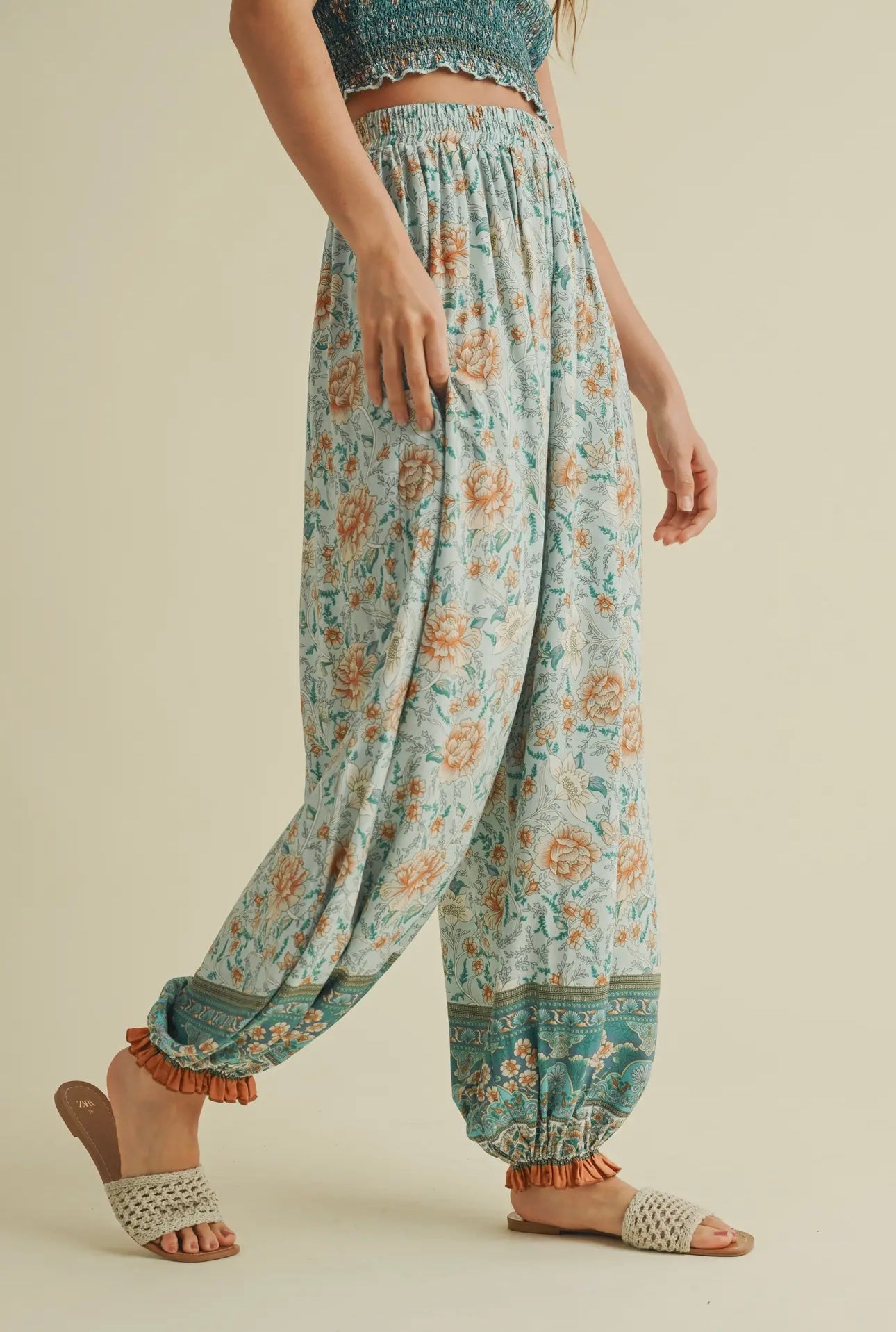 Turquoise and Orange Smocked Top and Floral Printed Pants