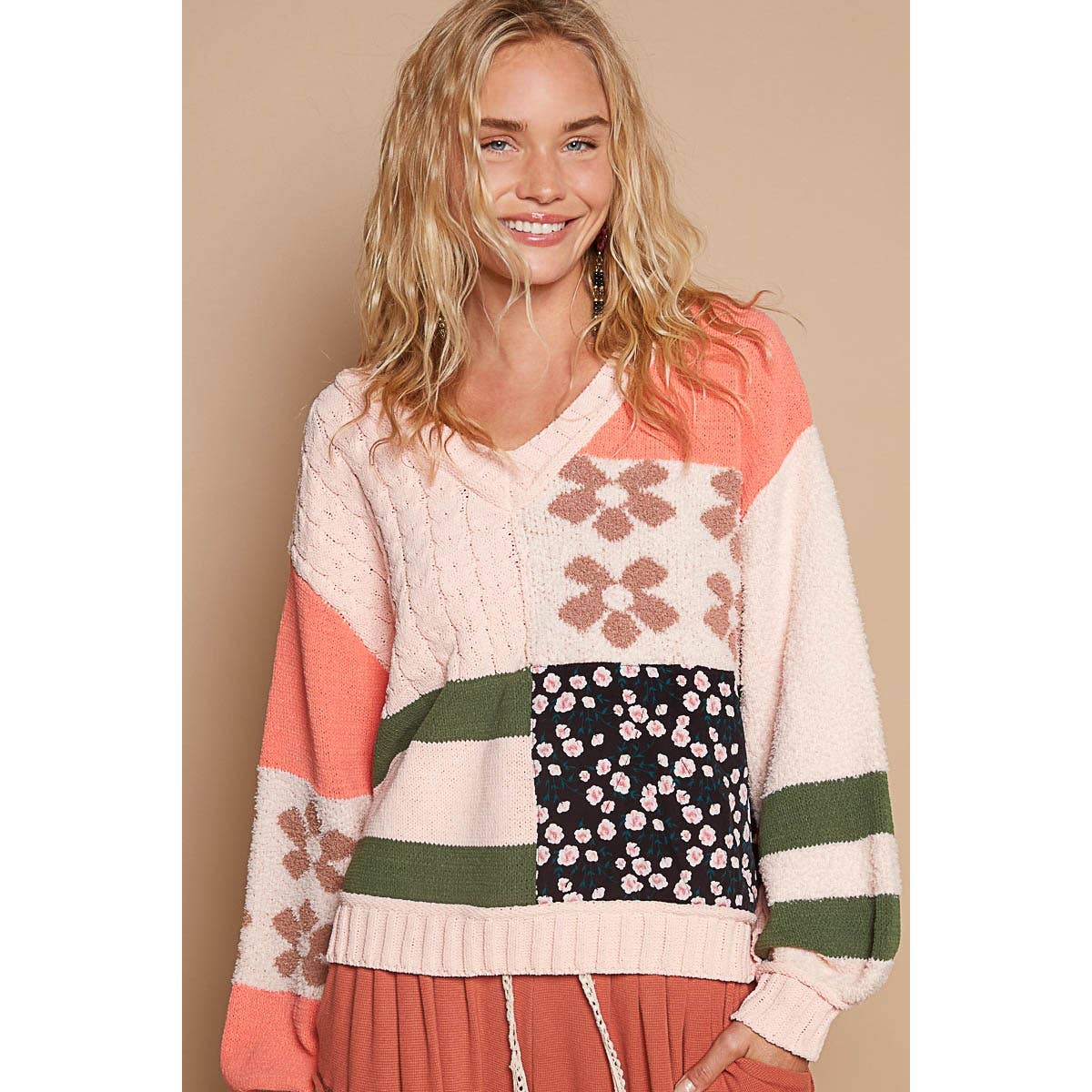 Coral and Green V-neck balloon sleeve color block floral sweater