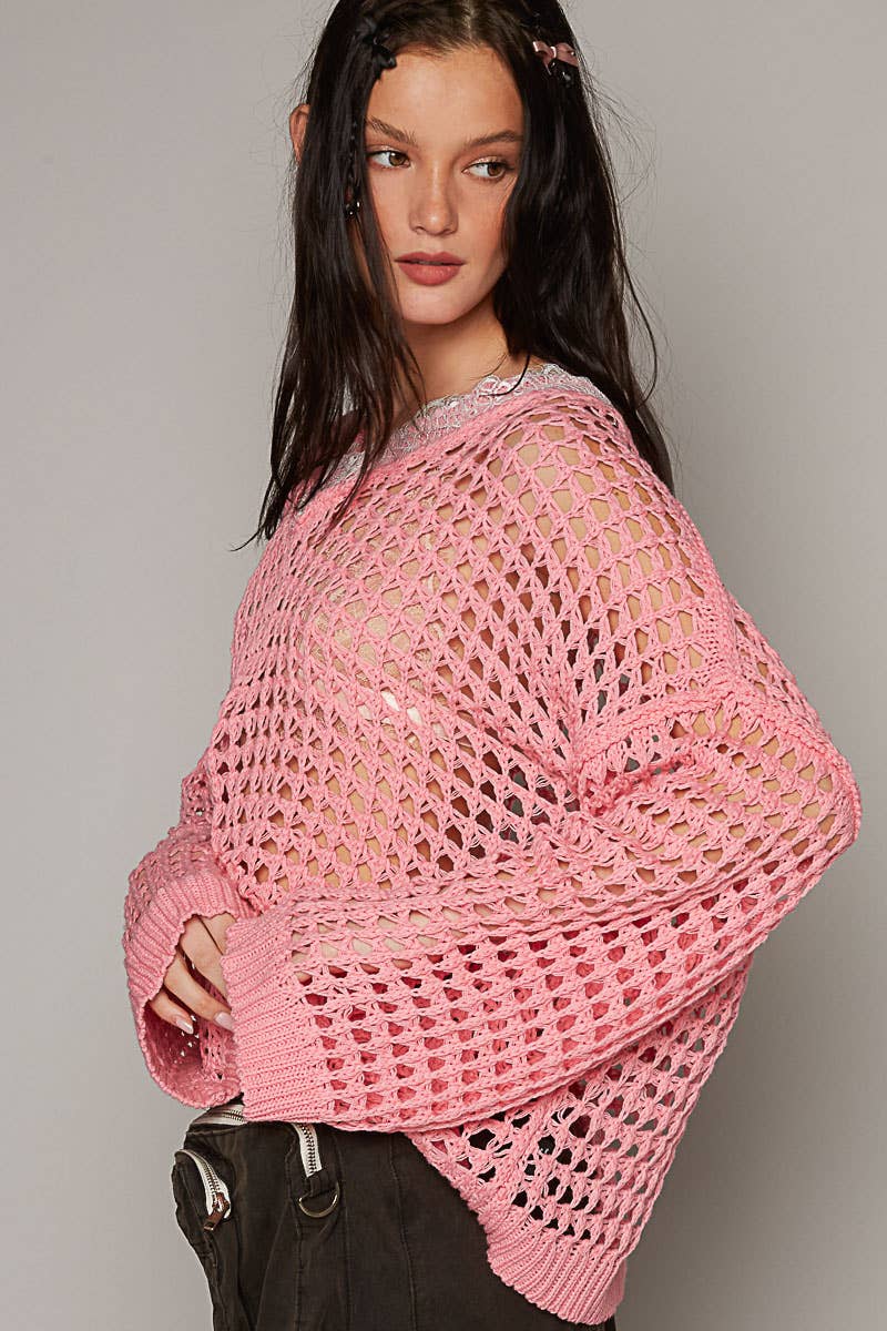 Barbie Pink V-Neck Long Sleeve Crochet Light Weight Sweater