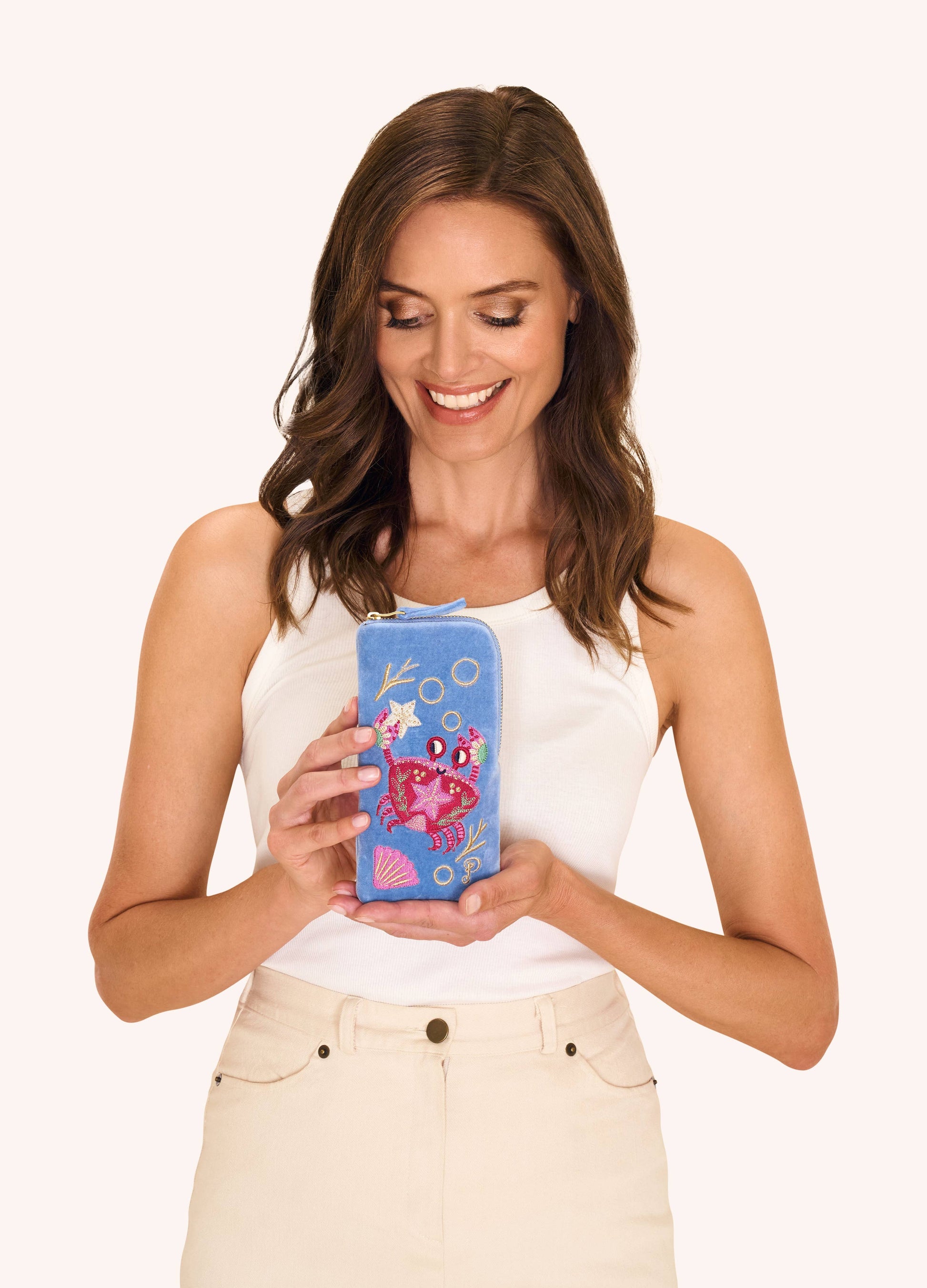 Dive into vibrant colours and playful embroidery! Our detailed seafaring crab dances around this luxurious velvet embroidered sunglasses pouch, sure to brighten your everyday. Carry down to evening drinks or keep in your hand luggage so your sunglasses always feel luxurious!
