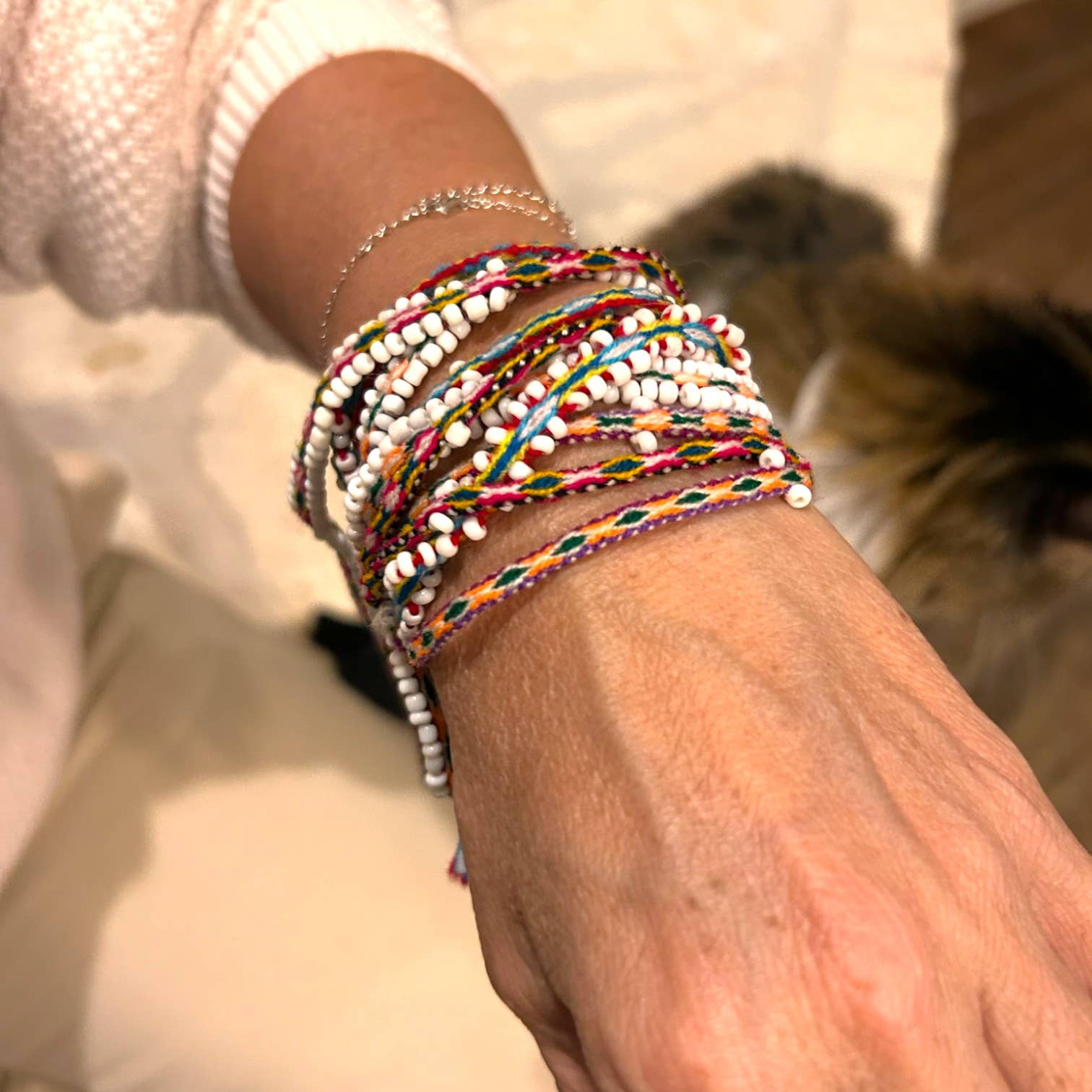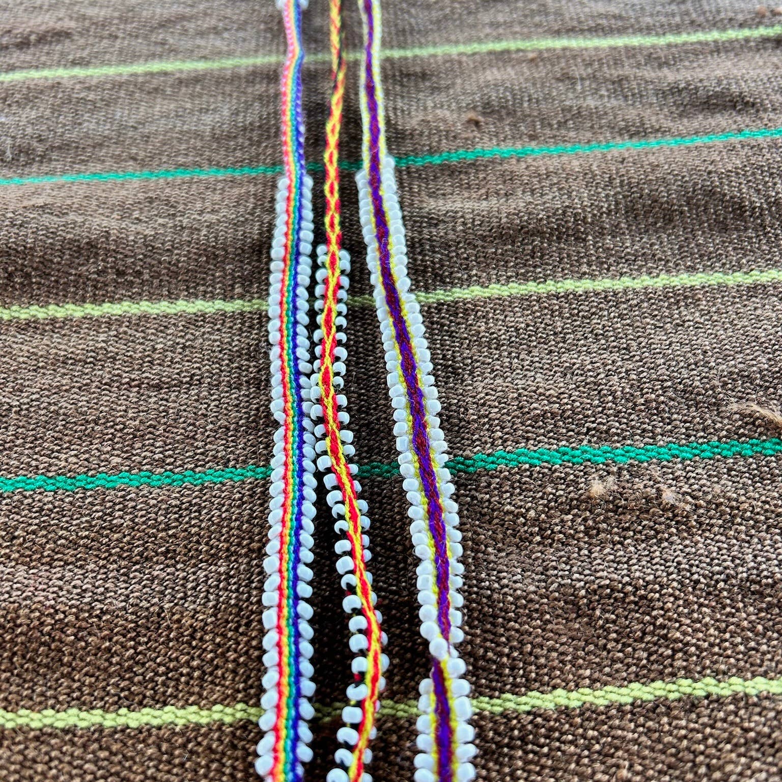 These colorful wool ties are adorned with tiny white “pini” beads, symbolizing the stars, making them both meaningful and visually stunning.