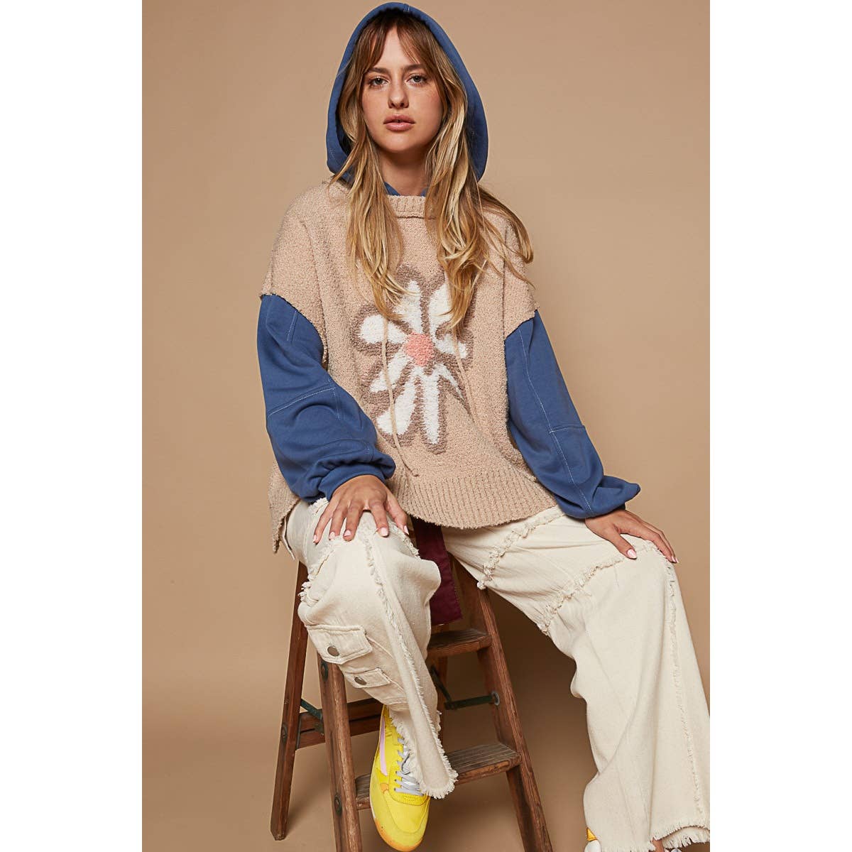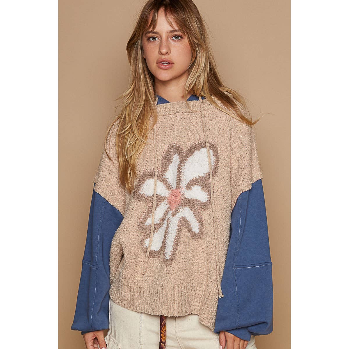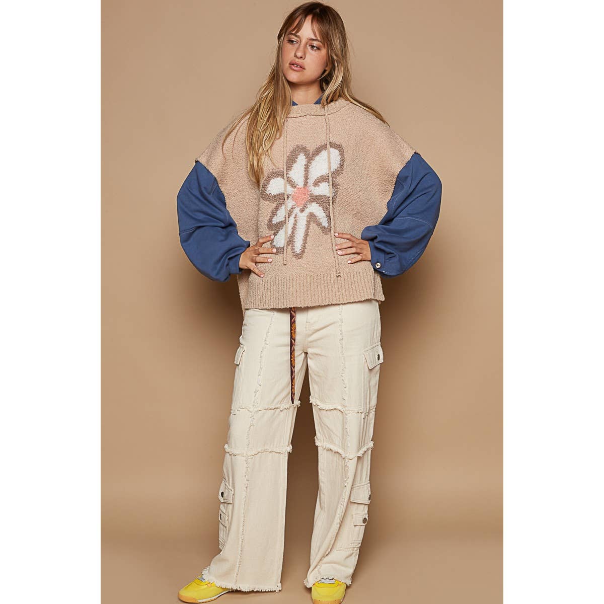 Wheat/Navy Oversized Balloon Sleeve Flower Sweater