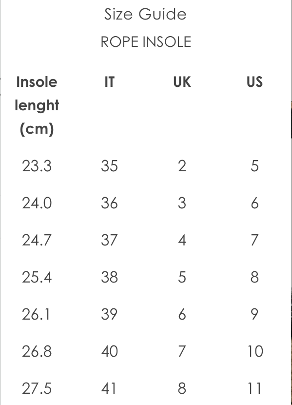 Technical info: Rubber insoles wrapped in natural rope, height 3.0-6.5 cm.